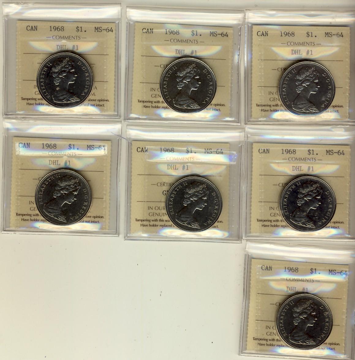 1968 $1 DHL#1 ICCS MS64. Lot of 7 coins.