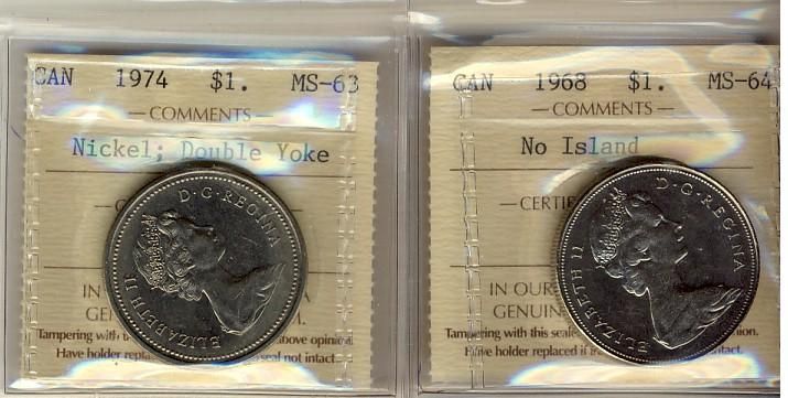 1968 $1 No Isl MS64 & 1974 Dbl Yoke Nickel MS63. Lot of 2 ICCS coins.