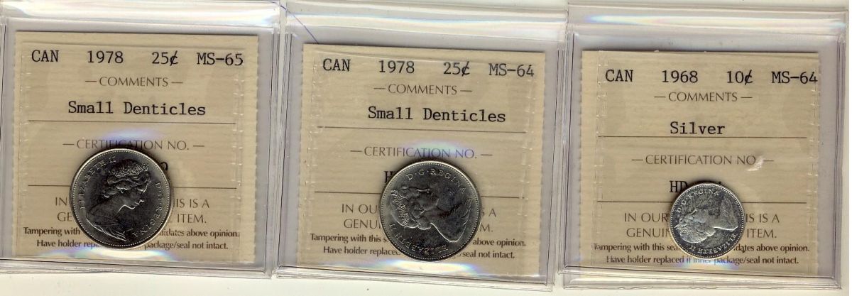 1968 10¢ Silver, 1978 25¢ Sml Dent MS64 & MS65. Lot of 3 ICCS graded coins.
