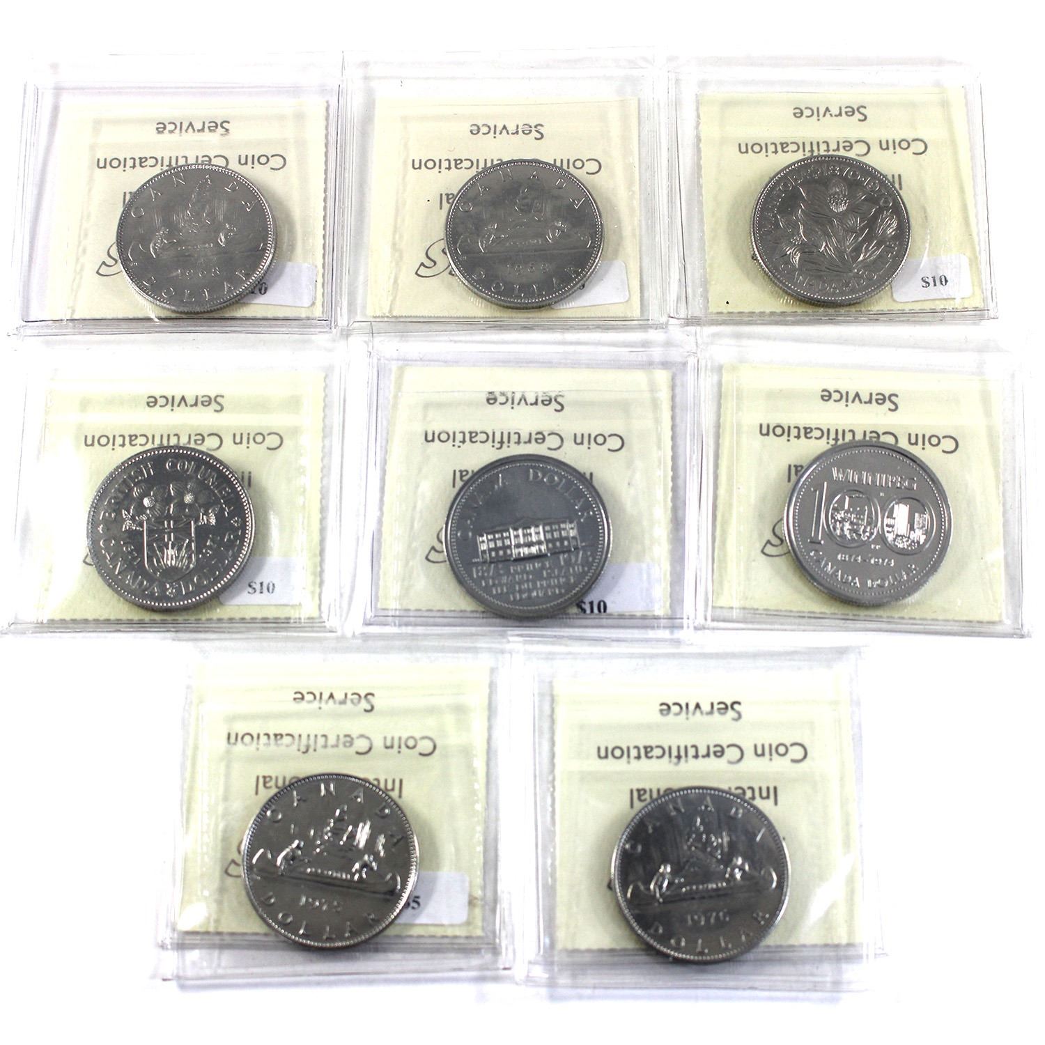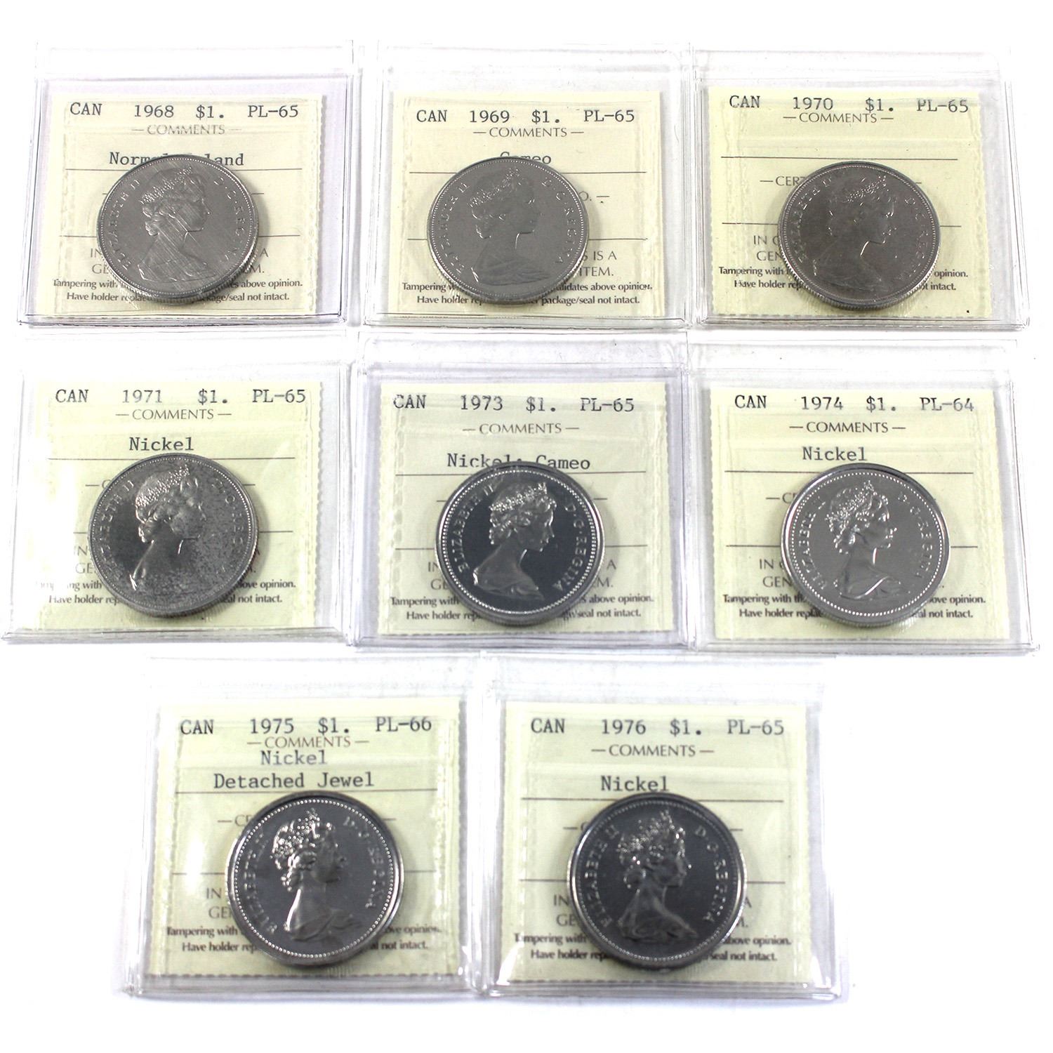 1968-1976 Canada Nickel $1 ICCS Certified PL64 to PL66 - 1968 Normal Island PL65, 1969 PL65 Cameo, 1970 PL65, 1971 PL65, 1973 PL65 Cameo, 1974 PL64, 1975 Detached Jewel PL66 & 1976 PL65. 8pcs