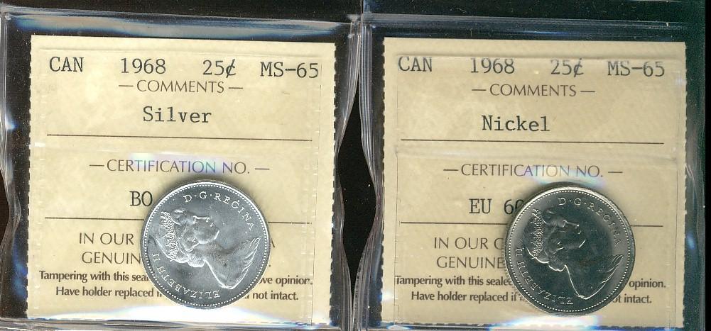 1968 25¢ Nickel and Silver ICCS MS65. Lot of 2 coins.