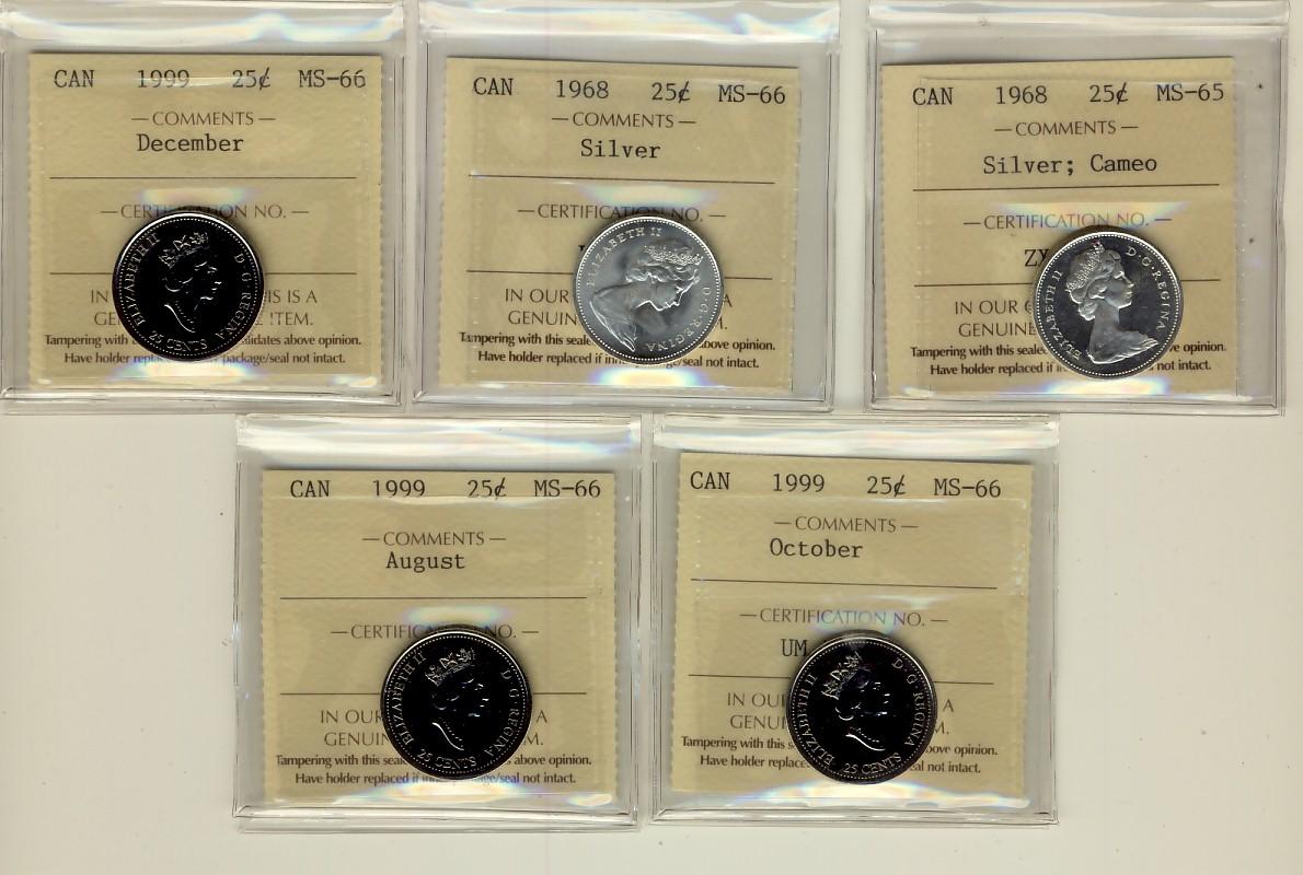1968 25¢ Silver MS65 & MS66, 1999 December, October & August MS66. Lot of 5 coins all ICCS graded.