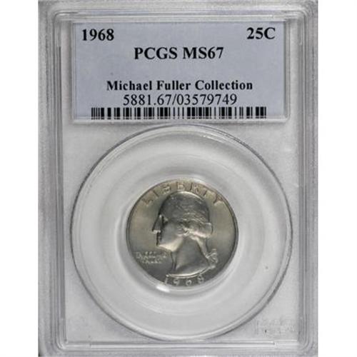 <B>1968 25C MS67 PCGS.</B></I> Michael Fuller Collection. PCGS Population (40/1). NGC Census: (26/2). Mintage: 220,731,504. Numismedia Wsl. Price for NGC/PCGS coin in MS67: $200. (#5881)<BR><BR><B>Coin Engraver:</B> John Flanagan<BR><BR><b>Shipping:</b> Coins & Currency (<a target="_blank" href="http://www.heritageauctions.com/common/shipping.php">view shipping information</a>)