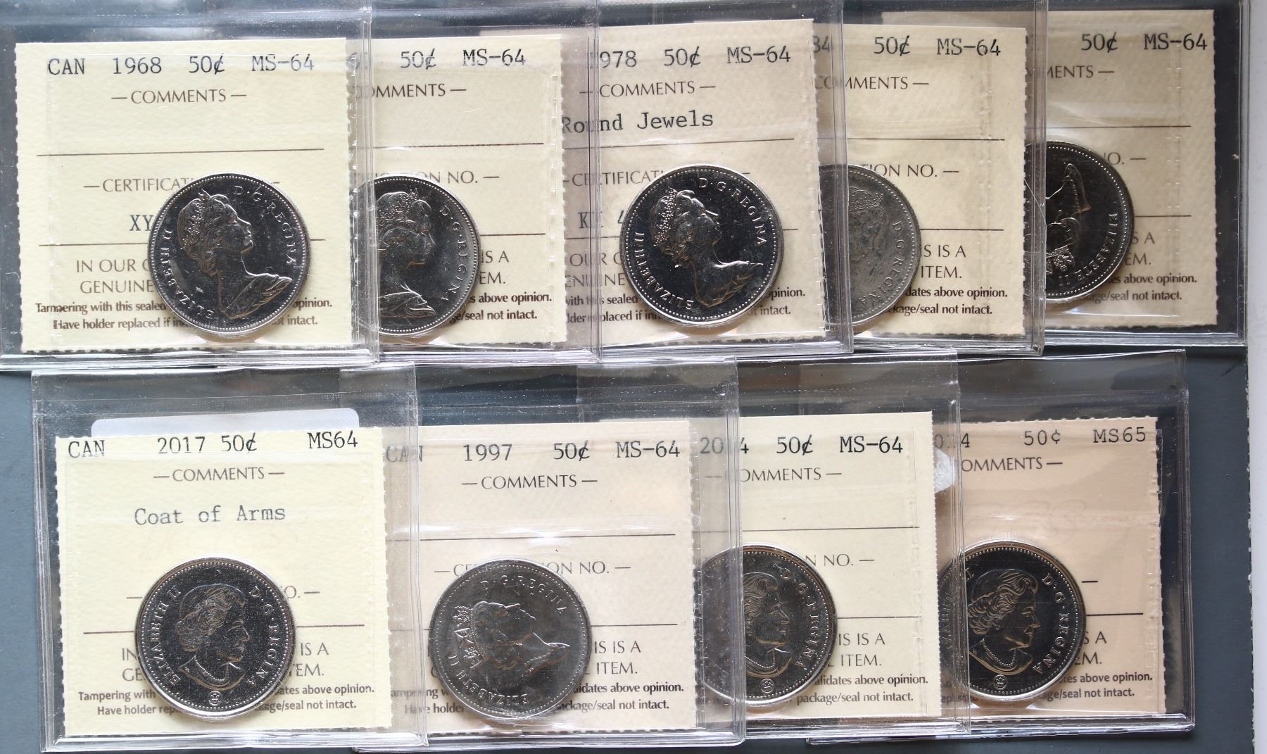 1968 50¢ to 2017 Lot of 9 ICCS Choice Mint State-64 graded coins. See Pic.