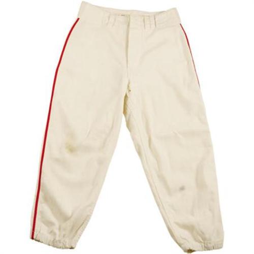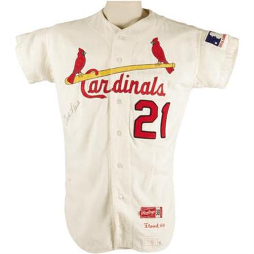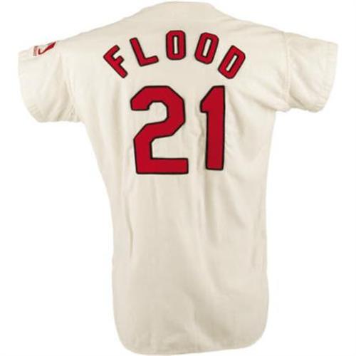 <B>1968-69 Curt Flood Game Worn Uniform.</B></I> The superstar Cardinal's 1,861 hits, .293 lifetime average, three All-Star appearances, and seven Gold Gloves tell the story of an excellent major league player, but fails to address his even greater relevance in baseball history as an instrumental figure in overturning the Major Leagues' reserve clause. Though the Supreme Court voted against his case and it disrupted his career and changed his life, it was an important battle which provided the union strength and platform for its mid '70's victories which opened up the salary floodgates. Every current player should salute Curt Flood and also salute his '68/'69 uniform which is not only earth-shaking in its beauty, but pristine in its condition.<BR><BR> Unlike most cotton/wool blend flannels of the era, this one has just a slight cream hue to the white flannel. All seven buttons are original and the red bird and bat chenille stitched front logo retains its colorful brilliance. The same holds true for the original front and back 2-color felt numerals and the all important arched name on back.<BR><BR> Notorious for quick removal of NOB's at season's end, this Cardinals' gem retains its original "Flood" with spectacular arch and spacing. The front tail sports some of the most beautiful decorative highlights of any 1960's flannel. A "Rawlings [size] 38" label was apropos for the diminutive but powerful 5' 9", 165 pound centerfielder. The washing instructions label with "Set 1 1968" flap tag are straight stitched beneath, leaving ample space for a "Flood 68" chain link identifier which rates a "10" on the calligraphy scale. A bonus feature is the presence of an original MLB 100th anniversary patch on the left sleeve, indicating use or backup use during the 1969 campaign.<BR><BR> Taking the superlatives a step further is a matching pair of Flood's flannel pants with 1/4" red braid side piping. Again, the inner waistband provides the best in 1960's flannel tailoring and decoration. A "Rawlings [size] 30" label, washing instructions and "Set 1 1968" flap tag are affixed in tandem. Accompanying this tagging schema is a 6" felt swatch (fully intact) with red chain link identifiers "Flood 68 30 22 ins" signifying player's name, year, size, and inseam. Flood has autographed the jersey front in bold black sharpie.<BR><BR> The only blemish, if one can call it such, is a well faded, quarter-inch tall markered name "Somerfeld." Whether that was a "cup of coffee minor leaguer" or a recipient of the jersey is unknown. But for sure, the jersey never saw more than a day in the minors, the condition is superb and as an all original representation, ranks as a 10+. And lest we forget in all the flannel hoopla, it represents an extremely talented and important figure in baseball history, and is eminently displayable. <I>LOA from Lou Lampson. LOA from PSA/DNA (autograph). LOA from James Spence Authentication (autograph).</B></I><BR><BR><b>Shipping:</b> Clothing, Costumes & Jerseys (<a target="_blank" href="http://www.heritageauctions.com/common/shipping.php">view shipping information</a>)