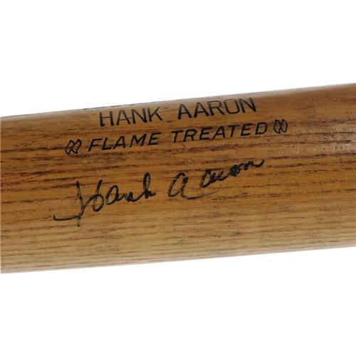 <B>1968-70 Hank Aaron Game Used Bat.</B></I> Spectacular specimen dates from a three-season stretch that saw Hank hammer 111 of his career's 755 home runs into the outfield seats. Top authenticator Dave Bushing describes the use as "Heavy," noting deeply embedded stitch marks that suggest quite strongly that at least a few homers were launched from this bat's barrel. The Adirondack 63A features the "teepee" center brand and block lettered "Hank Aaron" at barrel, with specifications of thirty-five and one-half inches and thirty-three and a half ounces, proper for Aaron's ordering records at the time. Number "44" is boldly proclaimed in vintage black marker on the knob and barrel end. Despite the fantastic evident use, this important lumber remains uncracked. A solid 9/10 black marker signature appears on the barrel for a final impressive touch. Though it appears that Barry Bonds may unseat Aaron from the top spot on the career charts, the Braves Hall of Famer will continue to reign in our hearts as the legitimate Home Run King regardless of the facts and figures. As such, any quality game used memorabilia such as this should remain the most solid of investments. Graded A9. <I>LOA from Dave Bushing. LOA from James Spence Authentication. LOA from PSA/DNA.</B></I><BR><BR><b>Shipping:</b> Bats, Clubs, Sticks, Swords, Rif (<a target="_blank" href="http://www.heritageauctions.com/common/shipping.php">view shipping information</a>)