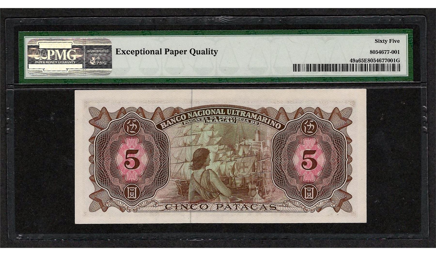 One 1968 Banco Nacional Ultramarino Macau 5 Patacas Note PMG Gem Uncirculated 65EPQ. PMG Certified.