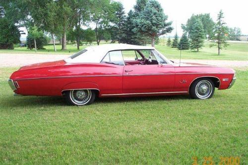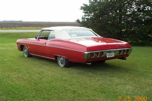 THIS IS A NICE 1968 CHEVROLET IMPALA CONVERTIBLE. IT IS RED AND THE PAINT IS NICE. THERE IS A RED INTERIOR AND IT RUNS AND DRIVES WELL. IT IS CLEAN AND APPEARS RUST FREE. IT HAS A WHITE CONVERTIBLE TOP. IT IS A 327 WITH POWERGLIDE TRANSMISSION. POWER STEERING, POWER TOP WITH PARADE BOOT. ECXCELLENT DRIVING CAR. AUTOMATIC TRANS.