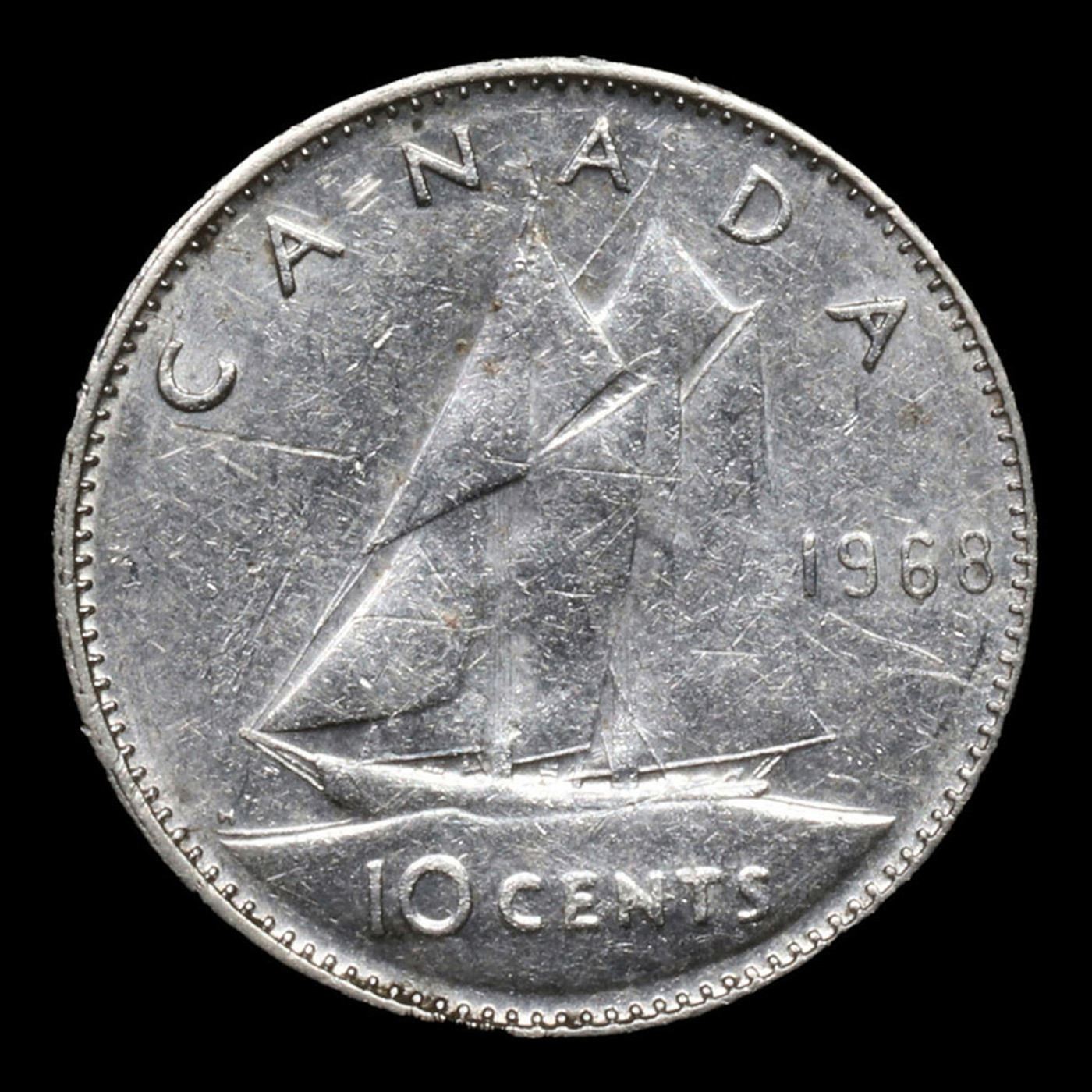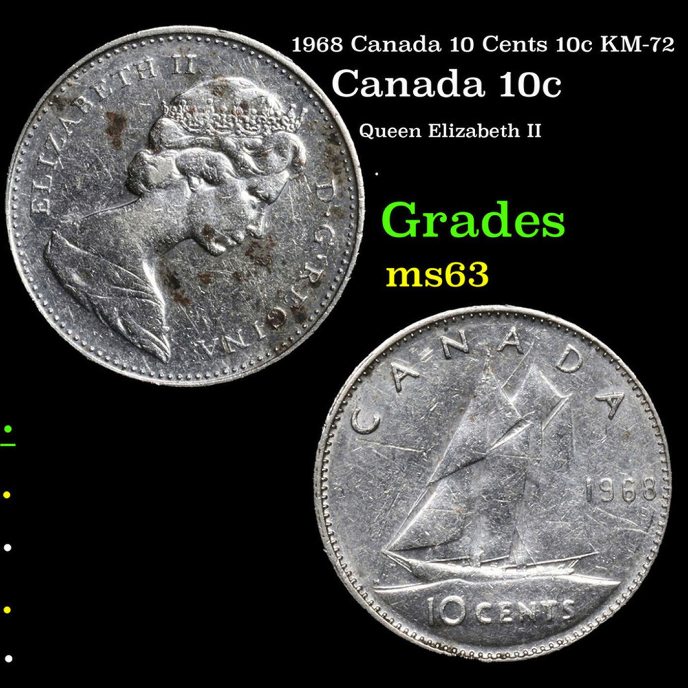 1968 Canada 10 Cents 10c KM-72 Grades Select Unc. Elizabeth was born in Mayfair, London, as the first child of the Duke and Duchess of York (later King George VI and Queen Elizabeth). Her father acceded to the throne in 1936 upon the abdication of his brother, King Edward VIII, making Elizabeth the heir presumptive. She was educated privately at home and began to undertake public duties during the Second World War, serving in the Auxiliary Territorial Service. In November 1947, she married Philip Mountbatten, a former prince of Greece and Denmark, and their marriage lasted 73 years until Philip's death in 2021. They had four children: Charles, Prince of Wales; Anne, Princess Royal; Prince Andrew, Duke of York; and Prince Edward, Earl of Wessex.When her father died in February 1952, Elizabeth—then 25 years old—became queen regnant of seven independent Commonwealth countries: the United Kingdom, Canada, Australia, New Zealand, South Africa, Pakistan, and Ceylon, as well as Head of the Commonwealth. Elizabeth has reigned as a constitutional monarch through major political changes such as the Troubles in Northern Ireland, devolution in the United Kingdom, the decolonisation of Africa, and the United Kingdom's accession to the European Communities and withdrawal from the European Union. The number of her realms has varied over time as territories have gained independence, and as some realms have become republics. Her many historic visits and meetings include state visits to the People's Republic of China in 1986, the Russian Federation in 1994, the Republic of Ireland in 2011, and visits to or from five popes.Significant events have included Elizabeth's coronation in 1953 and the celebrations of her Silver, Golden, Diamond and Platinum jubilees in 1977, 2002, 2012, and 2022, respectively. Elizabeth is the longest-lived and longest-reigning British monarch, the oldest and longest-serving incumbent head of state, and the second-longest reigning sovereign monarch in world history. She has faced occasional republican sentiment and press criticism of the royal family, particularly after the breakdown of her children's marriages, her annus horribilis in 1992, and the death in 1997 of her former daughter-in-law Diana, Princess of Wales. However, support for the monarchy in the United Kingdom has been and remains high, as does her personal popularity. Elizabeth died aged 96 at Balmoral Castle, Aberdeenshire, and was succeeded by her eldest son, Charles III.
