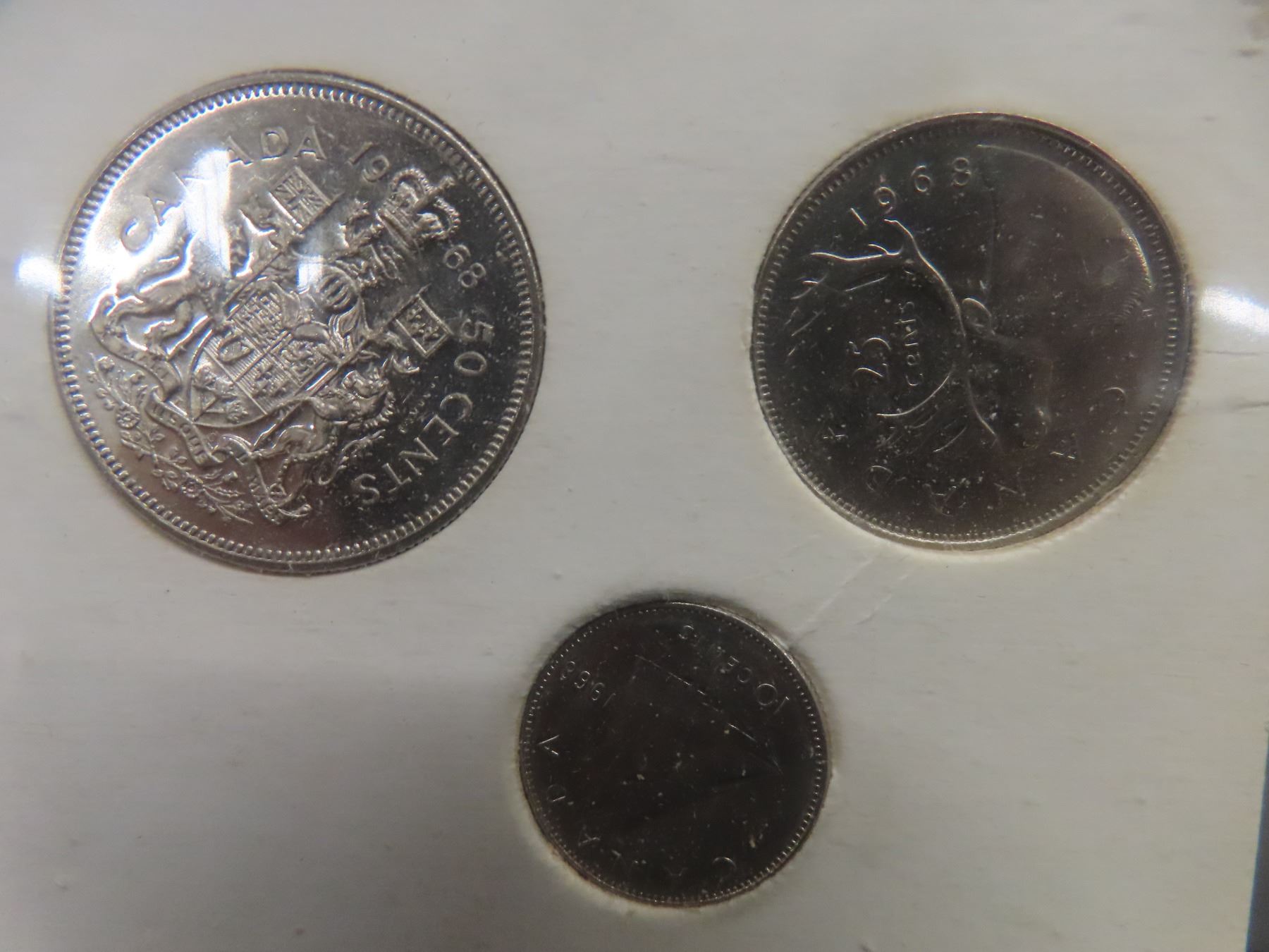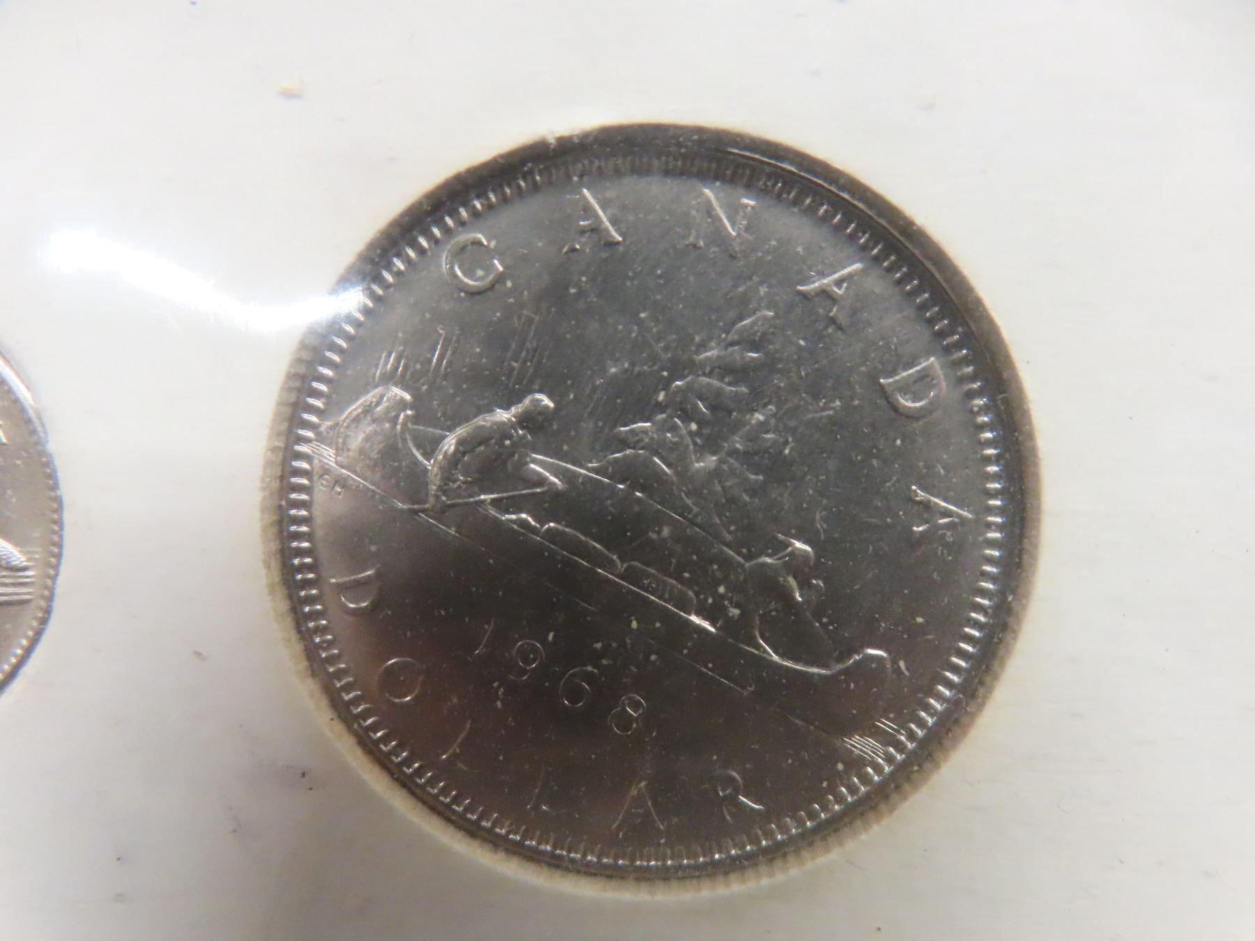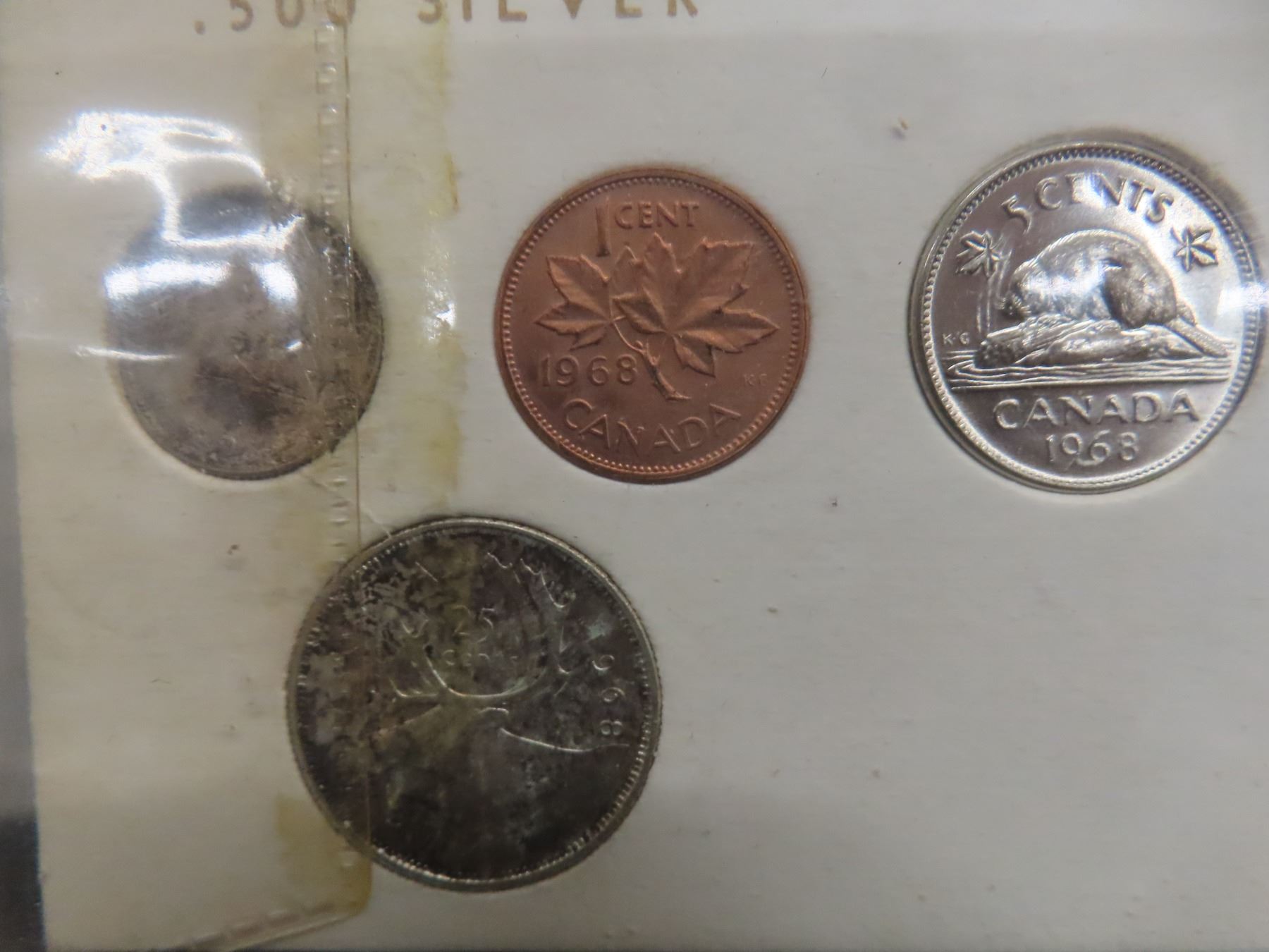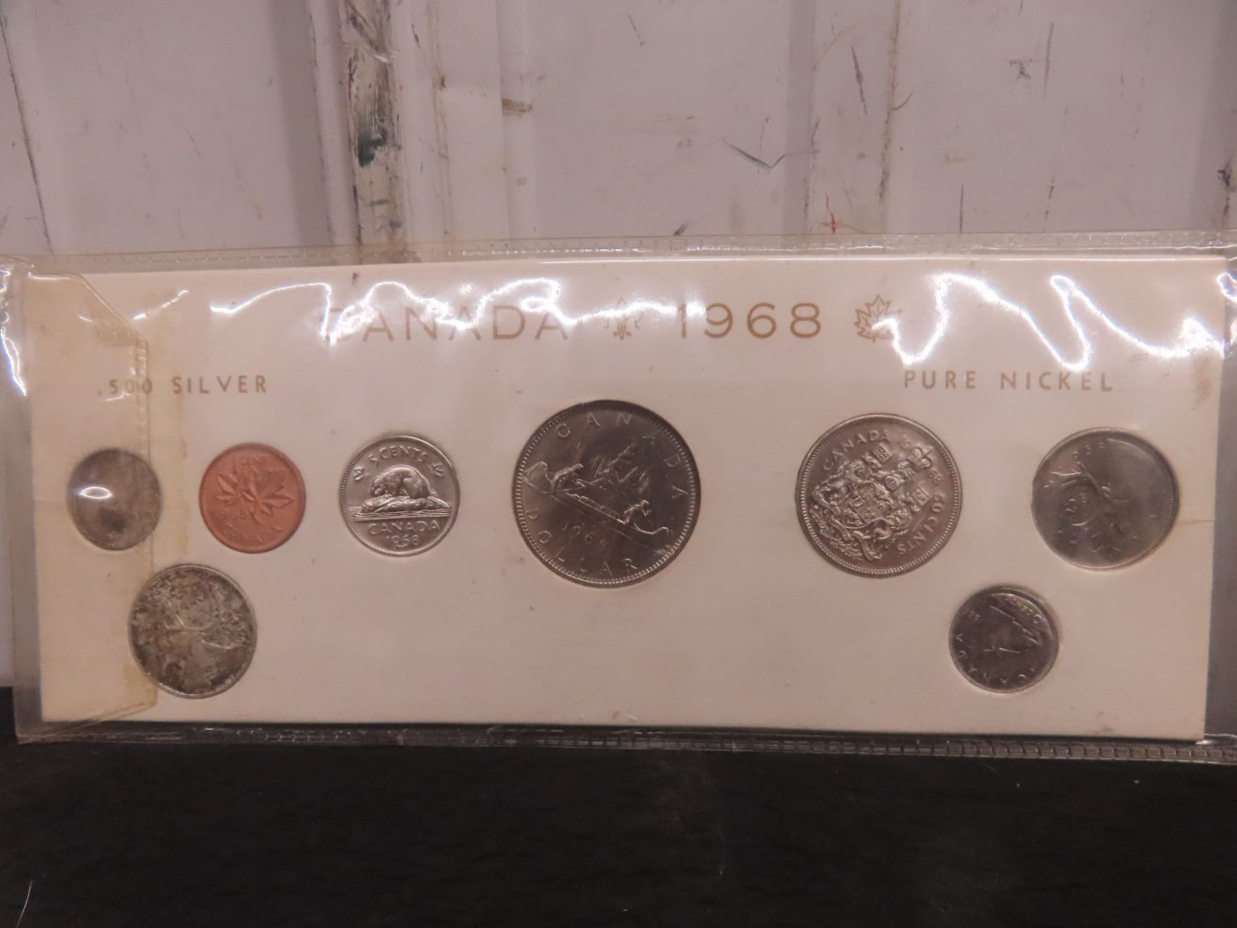 Factory-sealed set featuring all six denominations from 1¢ to $1. The 1968 set is notable for containing the last year of the silver Canadian dollar (this set includes the .500 silver version). Coins appear in their original packaging, with typical aging visible on the cello and some toning on a few pieces — common for sets of this vintage.