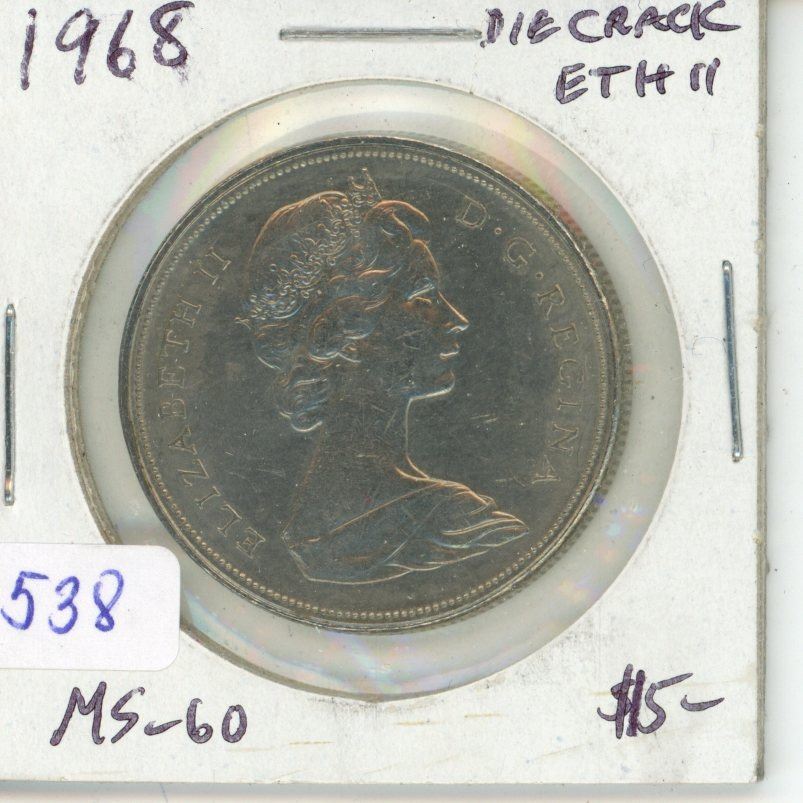 1968 Canadian Nickel Dollar. Die Crack at ETH II in Elizabeth II. MS-60.