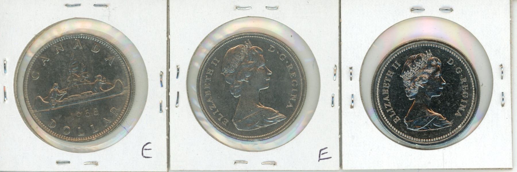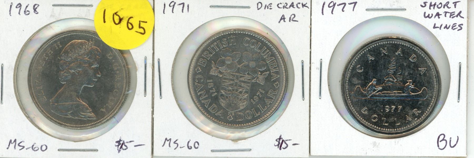 1968 Canadian Nickel Dollar with Die Crack at ETH II on the Obverse. MS-60. Scarce, 1971 Canadian Nickel Dollar with Die Crack at AR in DOLLAR. MS-60. Scarce and 1977 Canadian Nickel Dollar with Short Water Lines in front of the canoe. BU. Scarce.