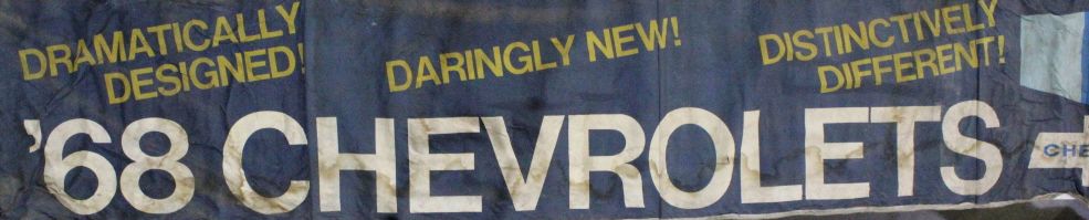 This is an original 1968 Chevrolet Dealer banner. The banner reads, "Dramatically Designed Daringly New Distinctly Different '68 Chevrolets (with half of the Chevy bow tie logo). The piece shows some slight staining, but is a rare and fantastic man cave or car collector item. The sign does not appear to have an major issues, tears, or rot. Measures 16ft 4in by 3ft 5in.