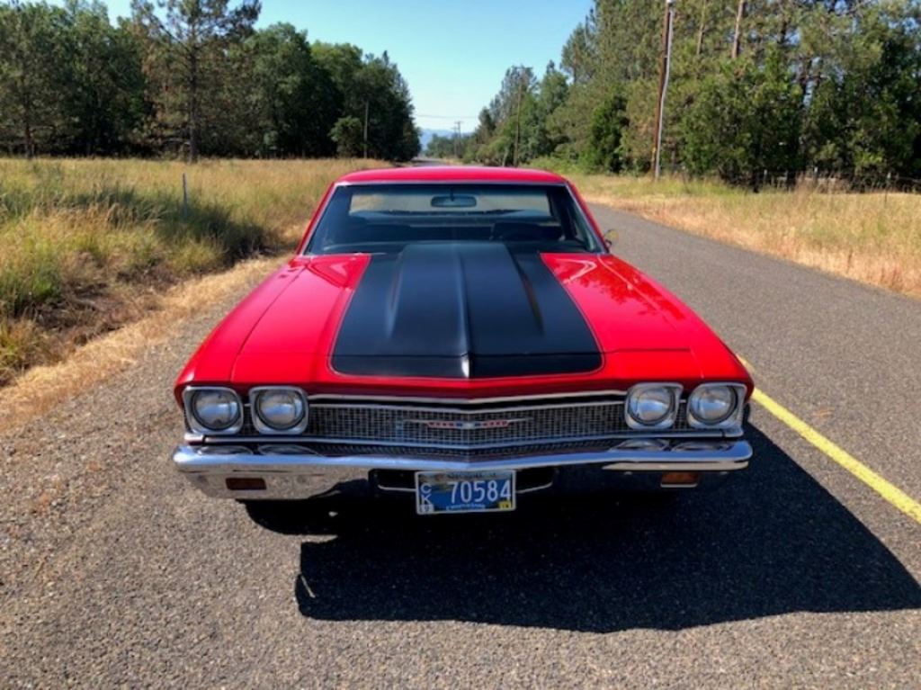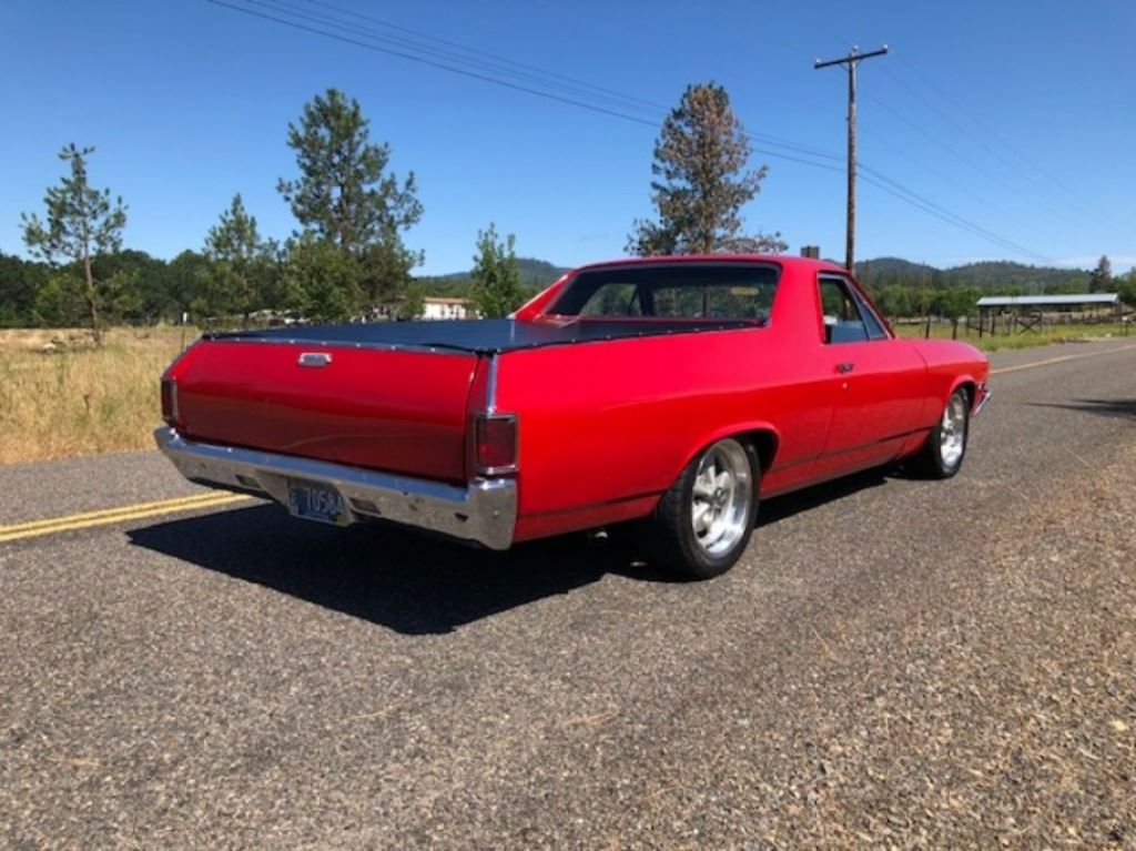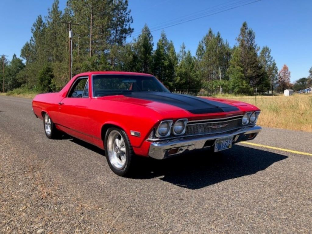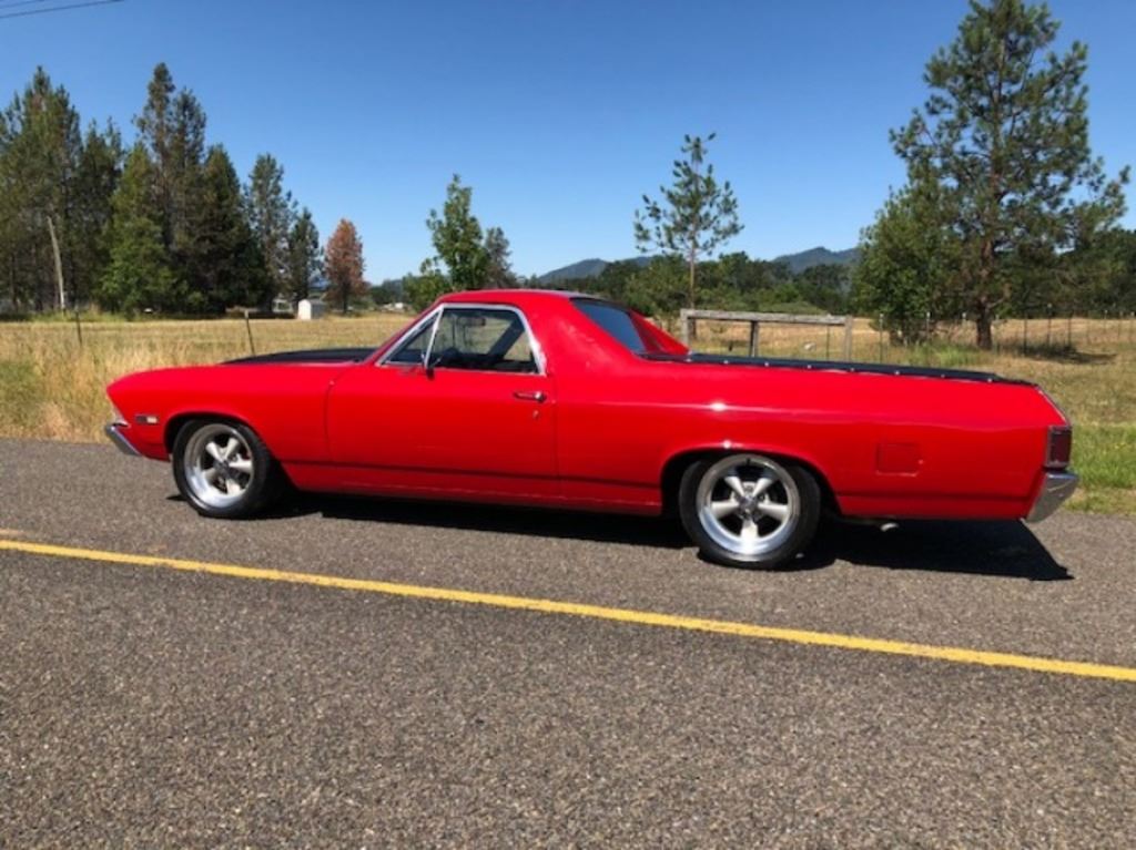 1968 Custom El Camino. 350 cid engine, Edelbrock intake, Edelbrock carb. Custom headers with replaced exhaust system. 700 R overdrive transmission with a shift kit. Power CPP disc brakes cross drilled up front. Power steering. Vintage air condition and heat. Carbon fiber dash with Autometer gauges with tach. Custom interior. Aluminum radiator with cooling fans. Cragar wheels with high speed radials tires. Snap on bed cover. Viper Red paint