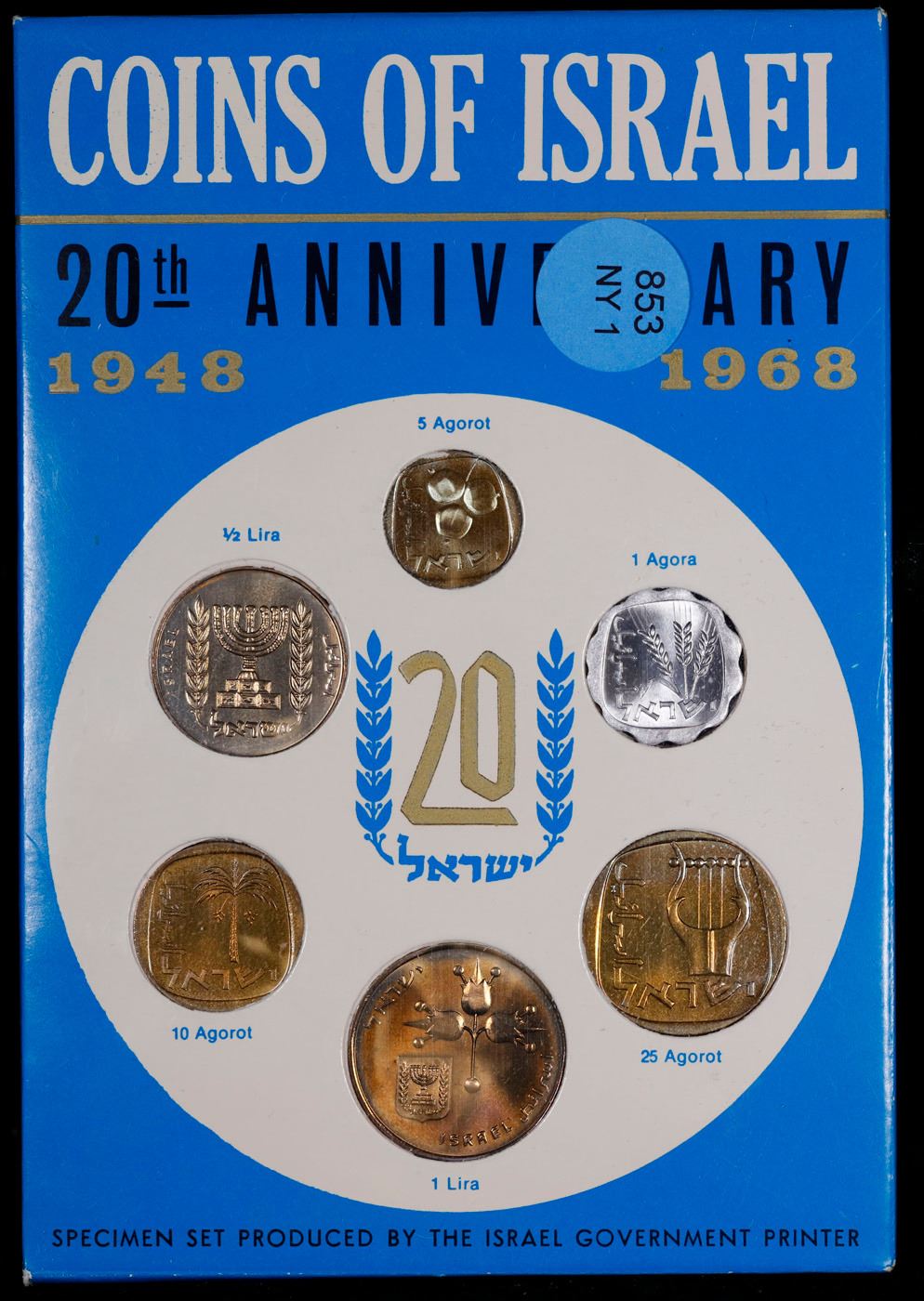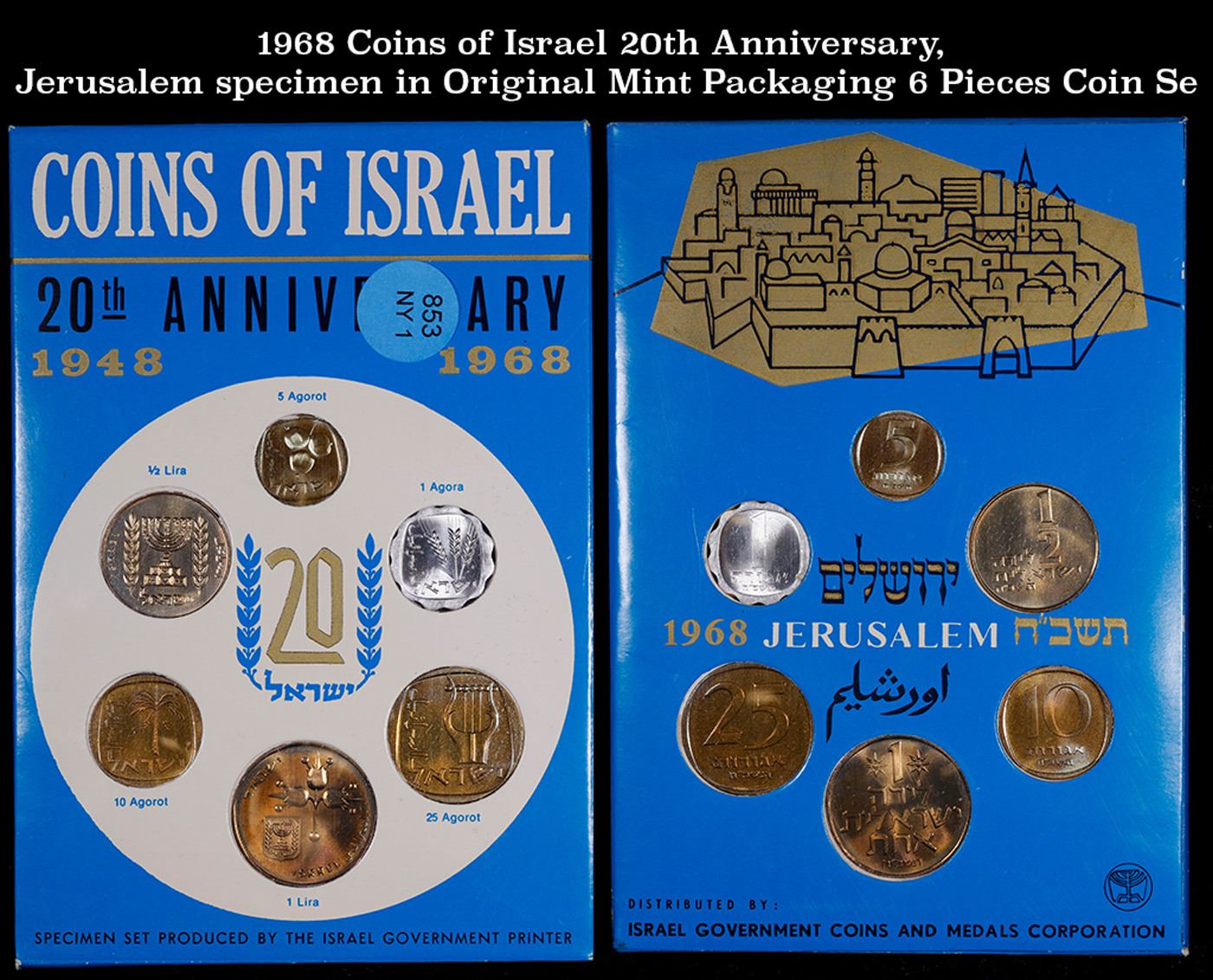 1968 Coins of Israel 20th Anniversary, Jerusalem specimen in Original Mint Packaging 6 Pieces Coin Set. Set in Original Mint Packaging the 1968 Israeli coin set is composed of six different denominations 1 agora, 5 agora, 10 agora, 25 agora, half-lira, and 1 lira. These coins are part of the 1975 year set issue that have the Star of David. Four of these coins are made of aluminum-bronze. The 1 agora coin is made of aluminum and the 1 lira coin is made of copper-nickel. One side of the coins all have the country name and face value in Hebrew, an engraving from old coins, and the Star of David. The other side of the coins features different agricultural products of Israel and the state emblem of Israel: a menorah flanked by two olive branches. However, the half-lira coin only shows the state emblem. The coins in the set are in mint condition. Distribute By: Israel Government Coins And Medals Corporation. In Original Packaging.