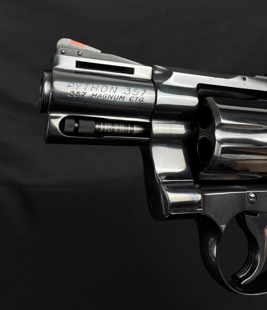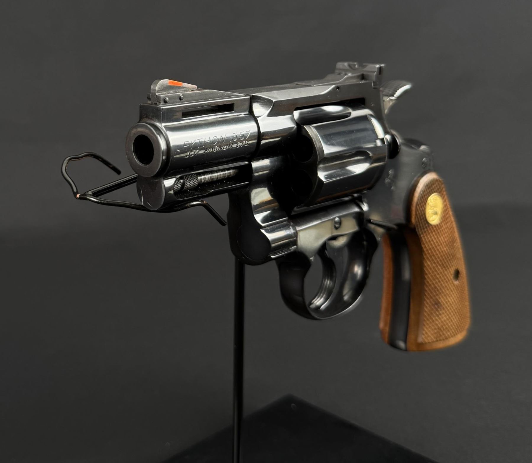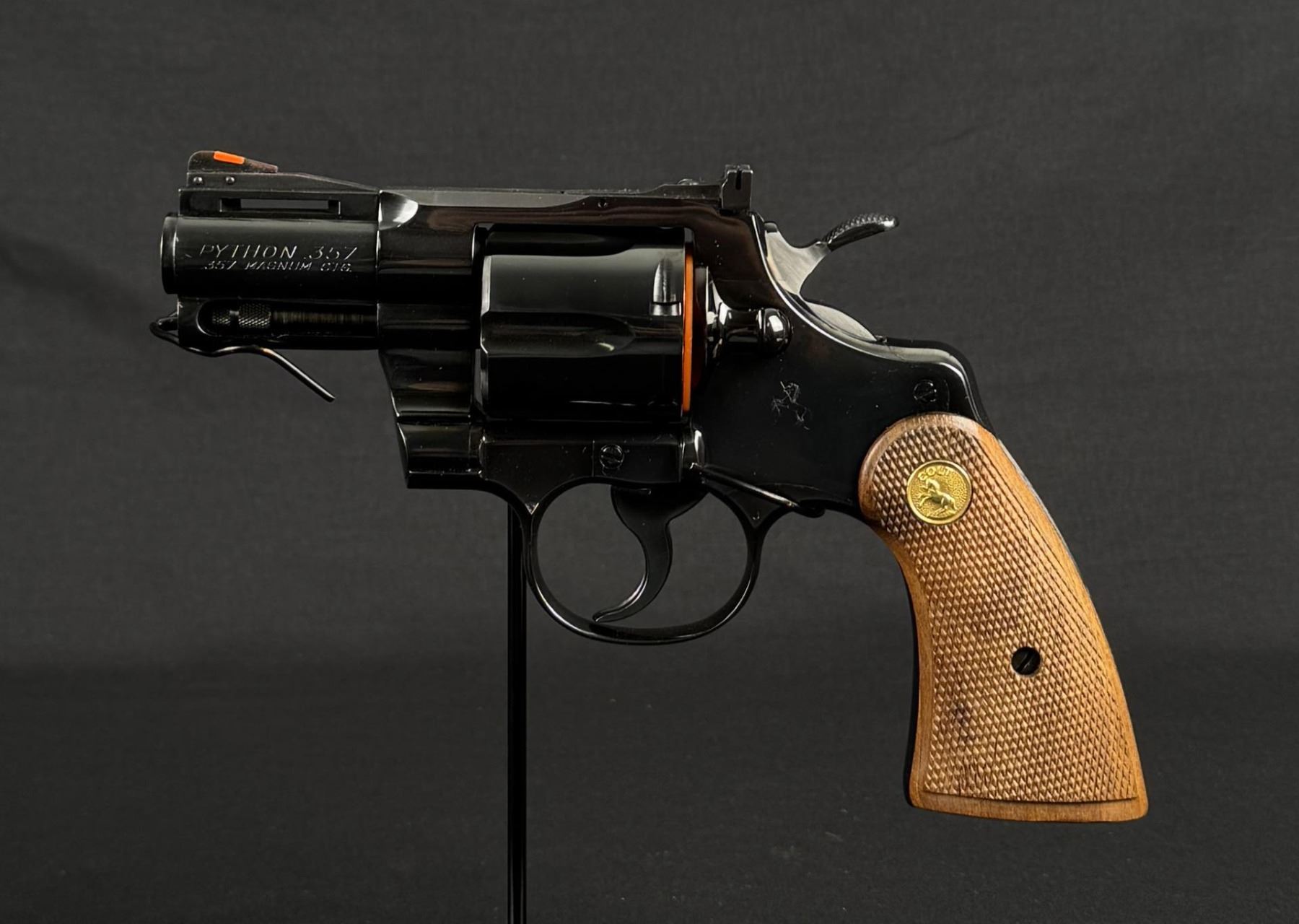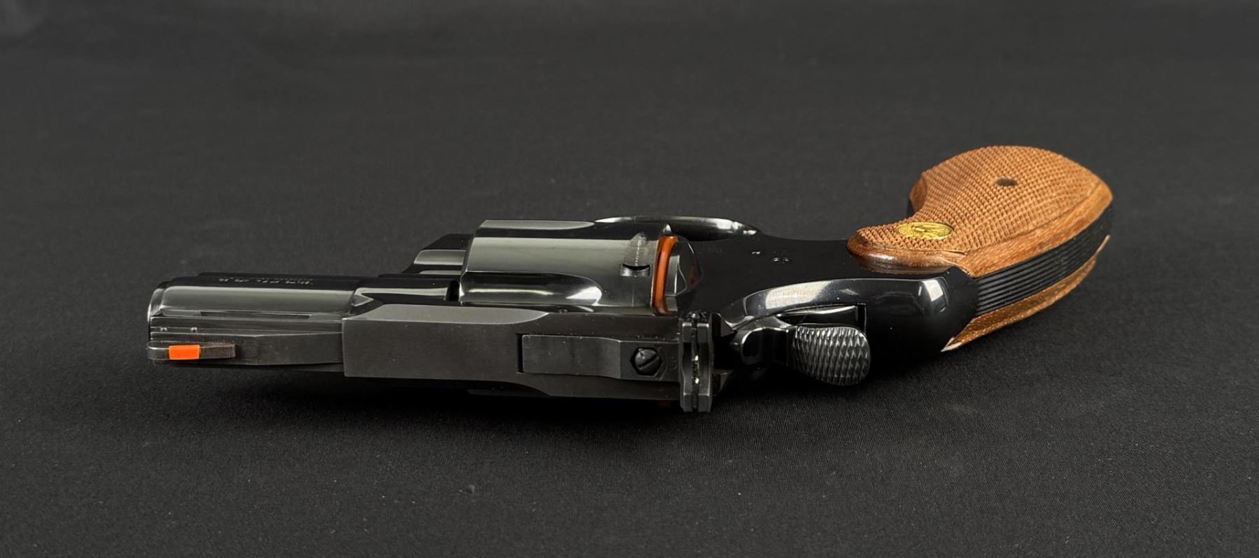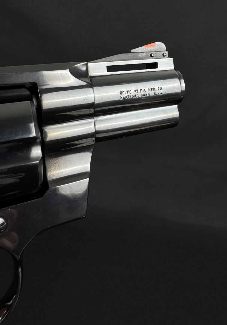 Exceptional example in original box. 2 1/2" Barrel. Red ramp front sight with white outline square notch adjustable rear sight. 6-shot fluted cylinder. Colt blue finished with polished hammer sides. 2-piece checkered walnut grips with gold Rampant Colt medallions. Manufactured in 1968. Requires FFL Transfer, C&R not accepted.