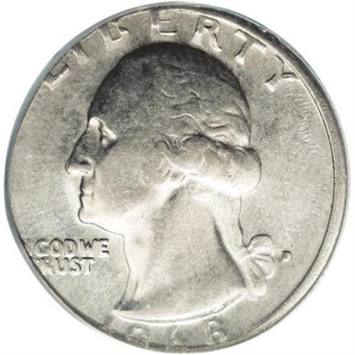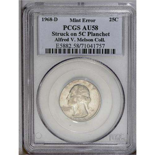 <B>1968-D<25C> Washington Quarter--Struck on a Five Cents Planchet--AU58 PCGS.</B></I> This battleship-gray and tan example is uncentered toward 9 o'clock. The date and mintmark are distorted but legible, and most of the left side legends are partly off the piece. A series of faint marks are located near the right obverse border.<BR><I>From The Bellaire Collection, Part Two.</B></I> <BR><BR><B>Important notice:</B> Heritage usually auctions material at the rate of 200-250 lots per hour. On some occasions eBay Live bid software or the Internet may not be able to keep up with the pace of the auction. We recommend placing a realistic absentee bid now as insurance to avoid disappointment. Occasionally the auctioneer may eliminate or reject an eBay Live bid, and the auctioneer may also reopen a lot after the close of the eBay live bidding (usually because we missed an audience bid), and may reject your bid even if it shows you as the winning bidder. By bidding via eBay Live, you agree that Heritage may award the lot to another bidder at its sole discretion under the circumstances described above or any other reasonable circumstances. Since eBay bids are not shown to us until we open the lot on the floor, we treat those bids just like floor bids. In most cases the floor responds before the eBay bid is presented to us, due to Internet lag time, so for consistency we have made it a policy that floor bids are always considered first over tie eBay live bids. Also please note that all Heritage lots purchased through eBay Live carry a 20% Buyer's Premium. Please make sure you read the Terms and Conditions before you bid. This lot is being auctioned in conjunction with a live floor auction by Heritage Galleries & Auctioneers. All final auction and invoice information will be supplied by Heritage Galleries & Auctioneers, and all other information should be considered preliminary. Lot:5343 <BR><BR><B>Winning Notification and Billing:</B> After the FINAL session in this auction is complete, Heritage will send e-mail and snail mail invoices. This process normally takes several days. All final auction and invoice information will be supplied by Heritage Galleries & Auctioneers, and all other information should be considered preliminary. <BR><BR>This auction will be conducted on a live auction floor and over the Internet through eBay Live. If you choose to place an absentee bid, please take a moment to <font color='#0000ff'><u><a href='http://pages.ebay.com/liveauctions/help/before/laabsentee.html'>learn how eBay Live absentee bidding works</a></u></font><font color='#000000'>