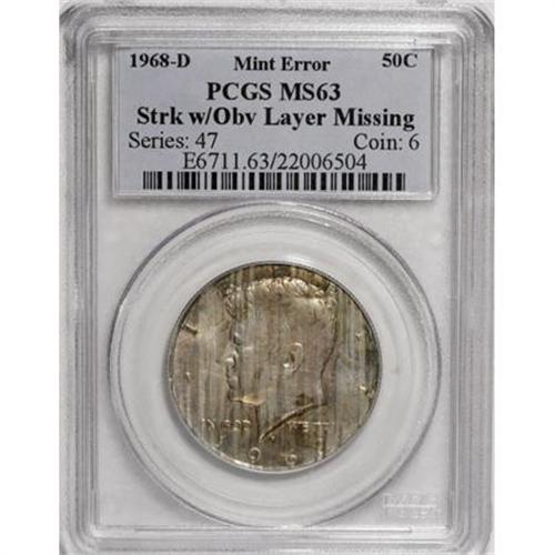 <B>1968-D 50C Kennedy Half Dollar--Struck with Obverse Layer Missing--MS63 PCGS.</B></I> <BR><BR><B>Coin Engraver:</B> Gilroy Roberts and Frank Gasparro<BR><BR><b>Shipping:</b> Coins & Currency (<a target="_blank" href="http://www.heritageauctions.com/common/shipping.php">view shipping information</a>)
