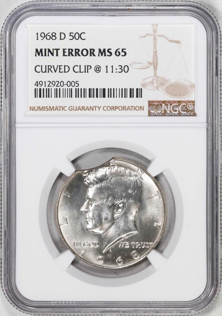 One 1968-D Kennedy Half Dollar Coin Mint Error - Curved Clip @ 11:30 NGC MS65. NGC Certified.