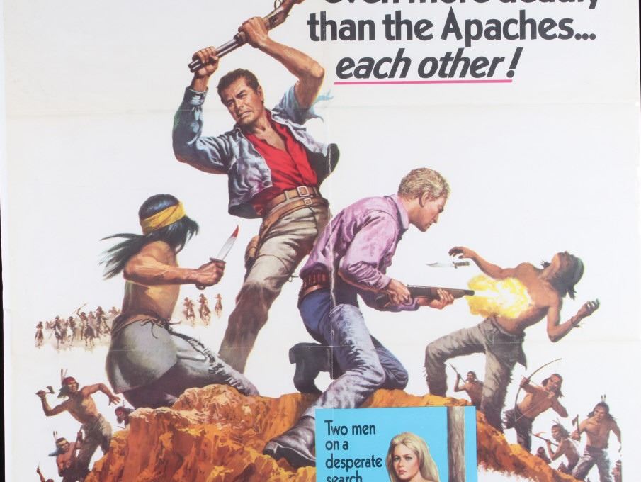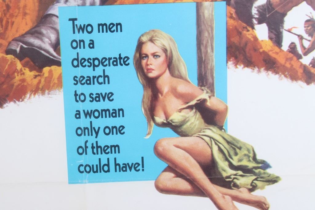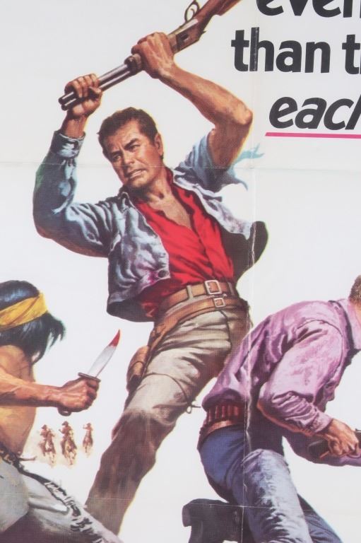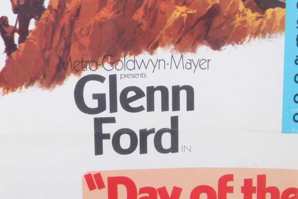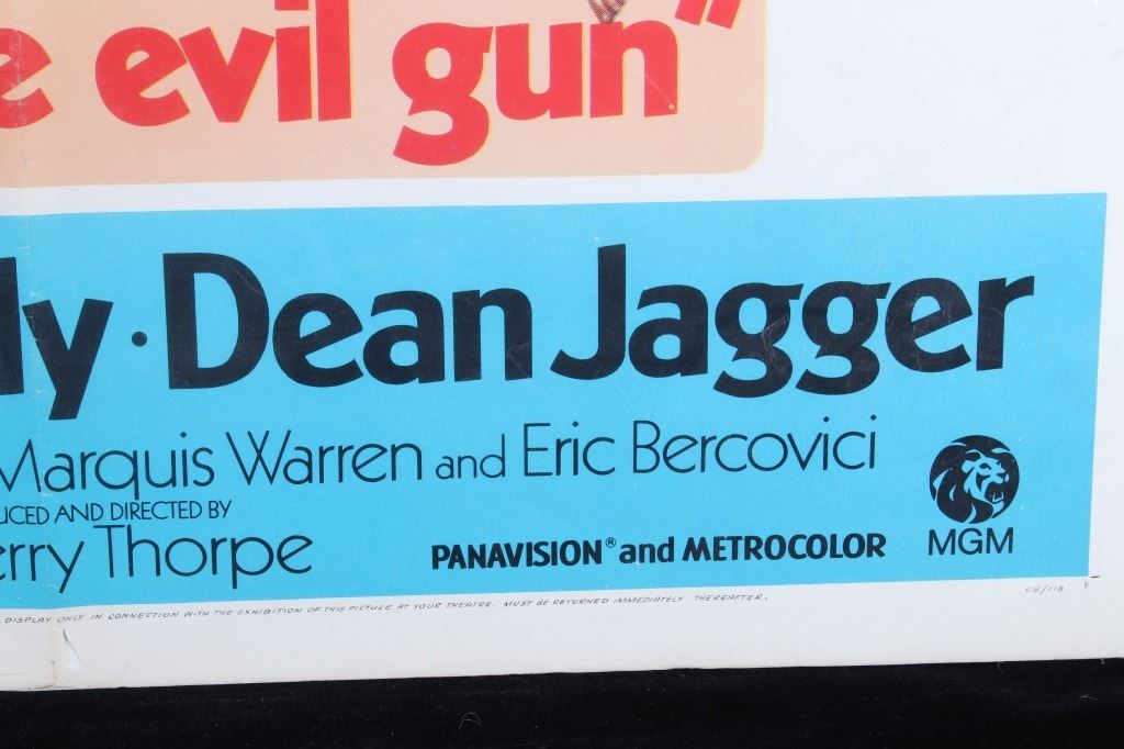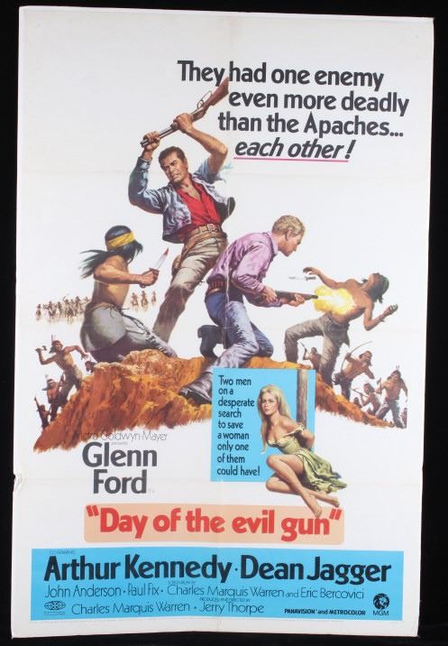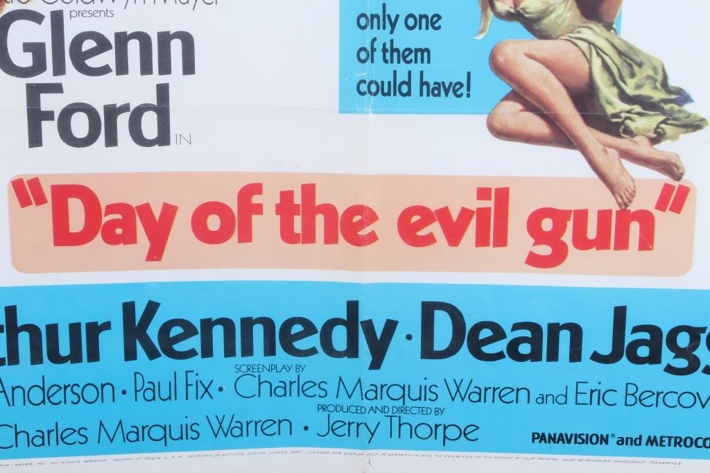 Featured in this lot is this 1968 “Day of the Evil Gun” Metro-Goldwyn-Mayer movie poster. The poster features the stars brandishing rifles against bands of Apache Indian warriors and a woman tied to a post. The poster reads as follows, “They had one enemy even more deadly than the Apaches... each other! - Two Men on a desperate search to save a woman only one of them could have! - Metro-Goldwyn-Mayer presents Glenn Ford in "Day of the evil gun" - Costarring Arthur Kennedy, Dean Jagger, screen play by John Anderson - Paul Fix - Charles Marquis Warren and Eric Bercovici, produced and directed by Charles Marquis Warren - Jerry Thorpe - Panavisino and Metrocolor.” There is an MGM logo in the bottom right-hand corner. The condition of this poster is fair, with a dent to the left-hand side of the poster. The measurements of this poster are 41 1/2" x 27 1/2".