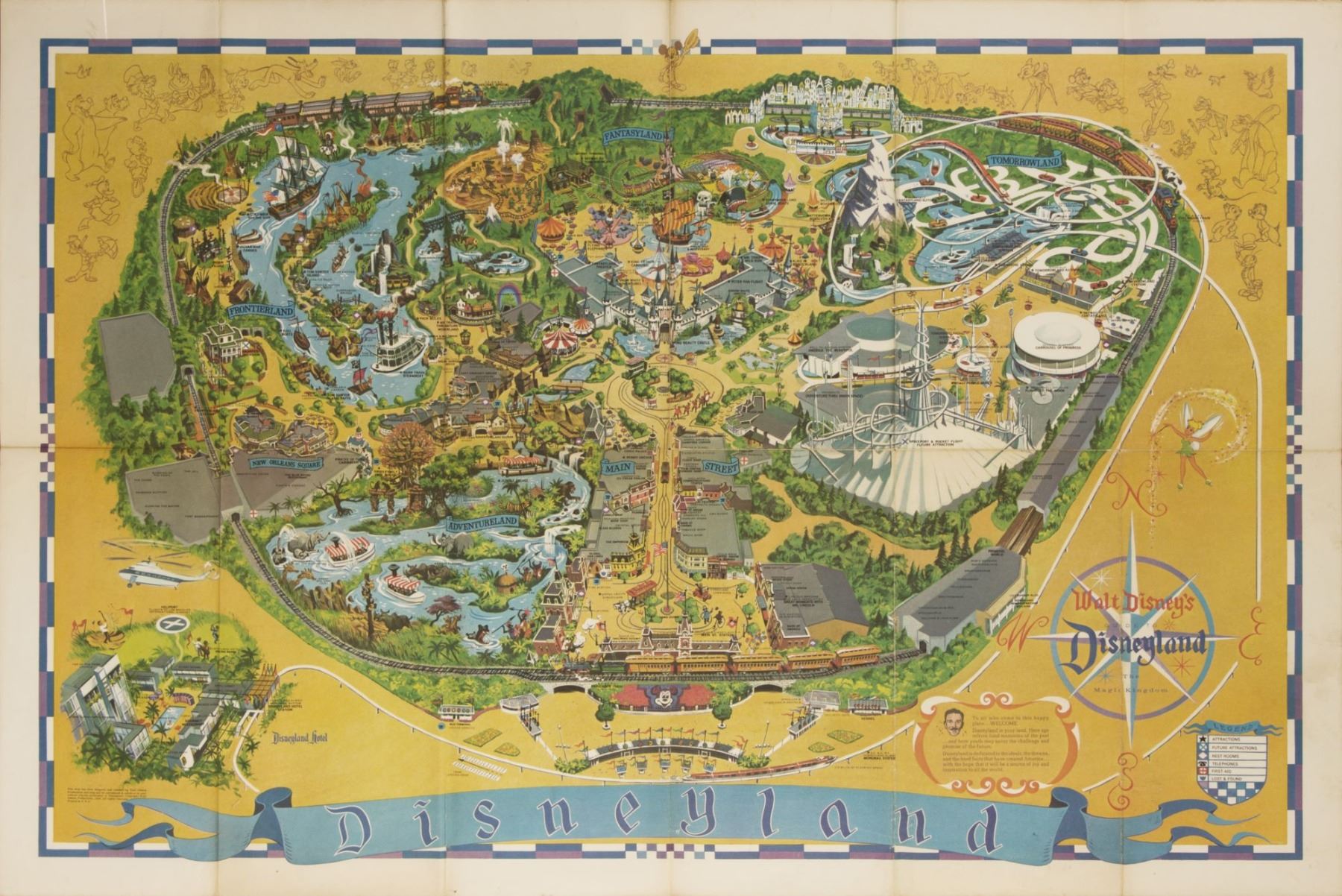 (Disneyland, 1968) This souvenir Disneyland map from 1968 features the new Adventures Thru Inner Space attraction while the House of the Future attraction has been removed. The map measures approximately 30"x45" and is in good condition with wear along the fold-lines, causing some spots of tearing at the intersections and edges of the folds. There is some yellowing from use and age.