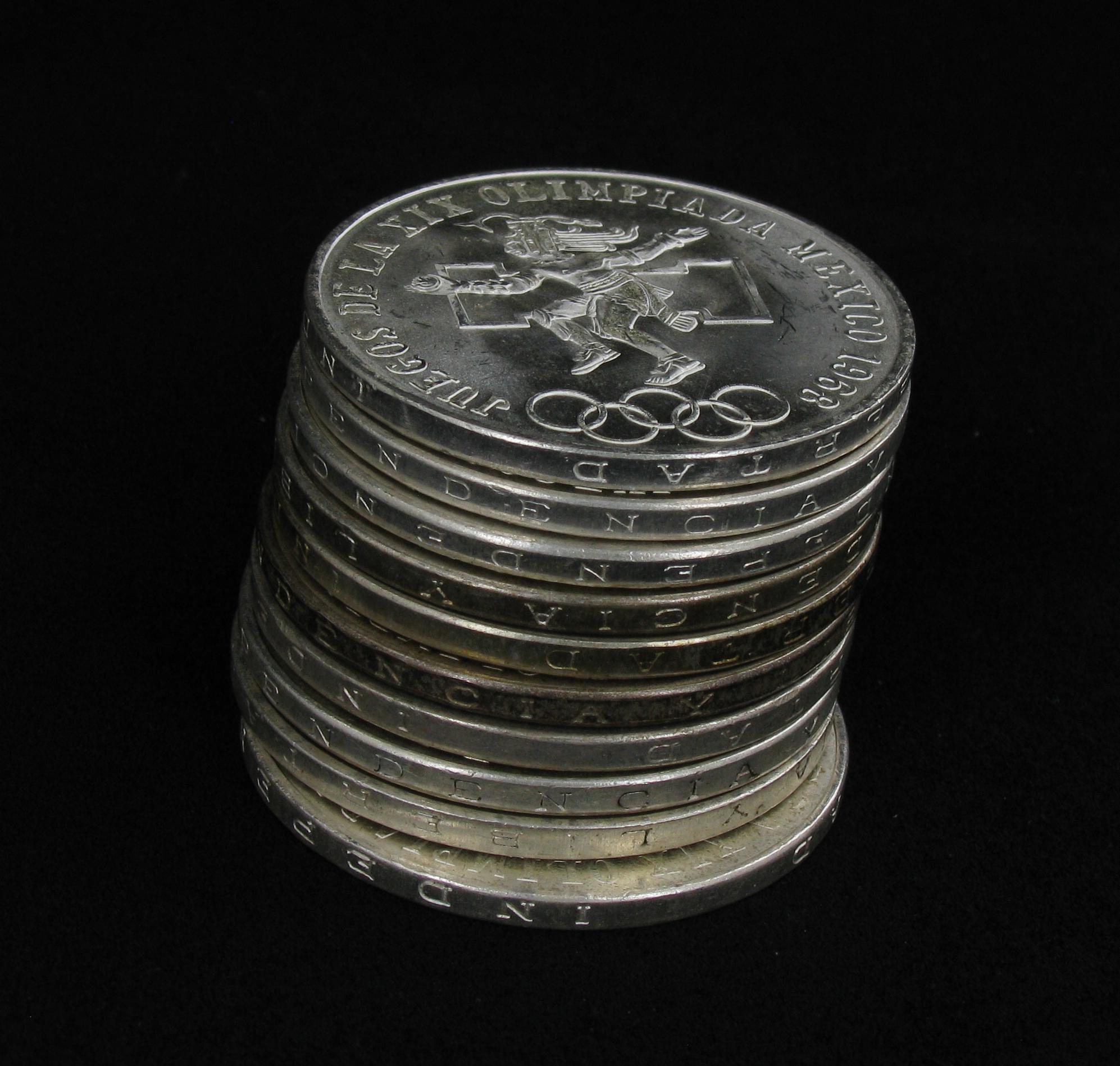 1968 Mexico Olympic Silver 25 Pesos Unsearched Stack of 10 Mostly BU 5.2 Ounces Silver! (COI-5234)