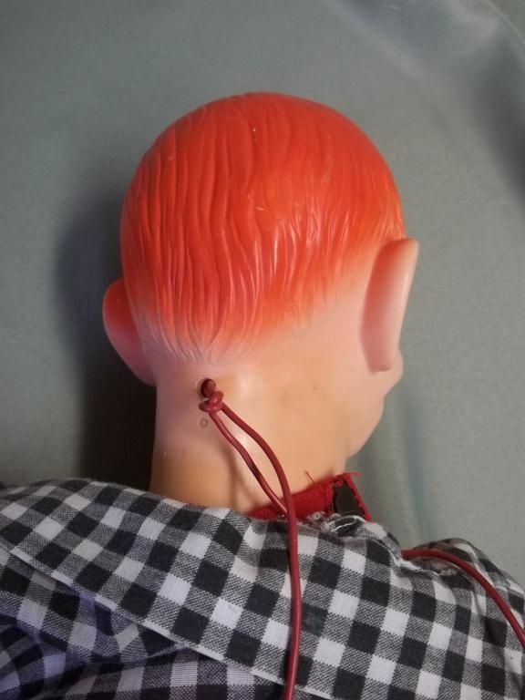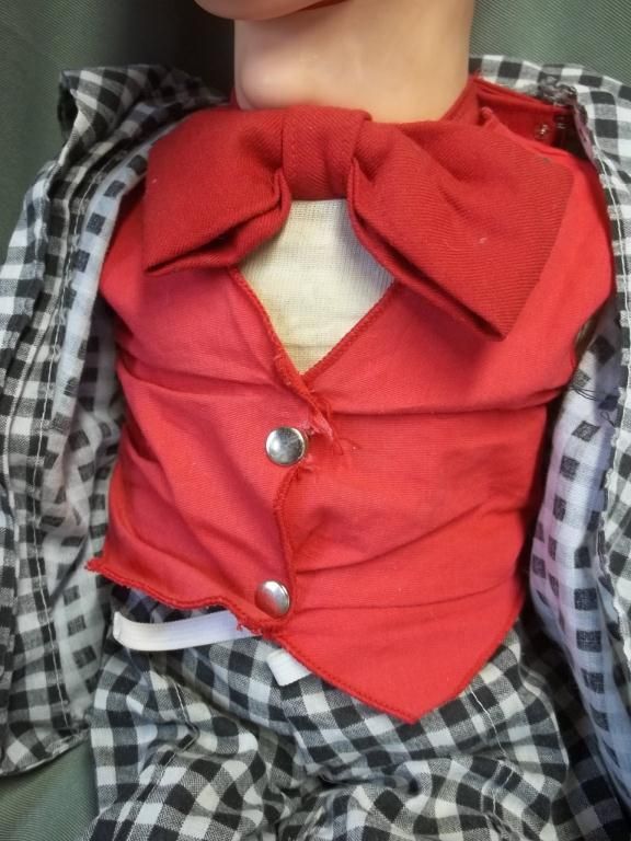 Juro Novelty 1968. Original clothing, less hat and shoes - leather moccasins have been added. Some wear to clothing. Original pull wire has been replaced with electrical wire. Edgar Bergen character puppet. About 30"