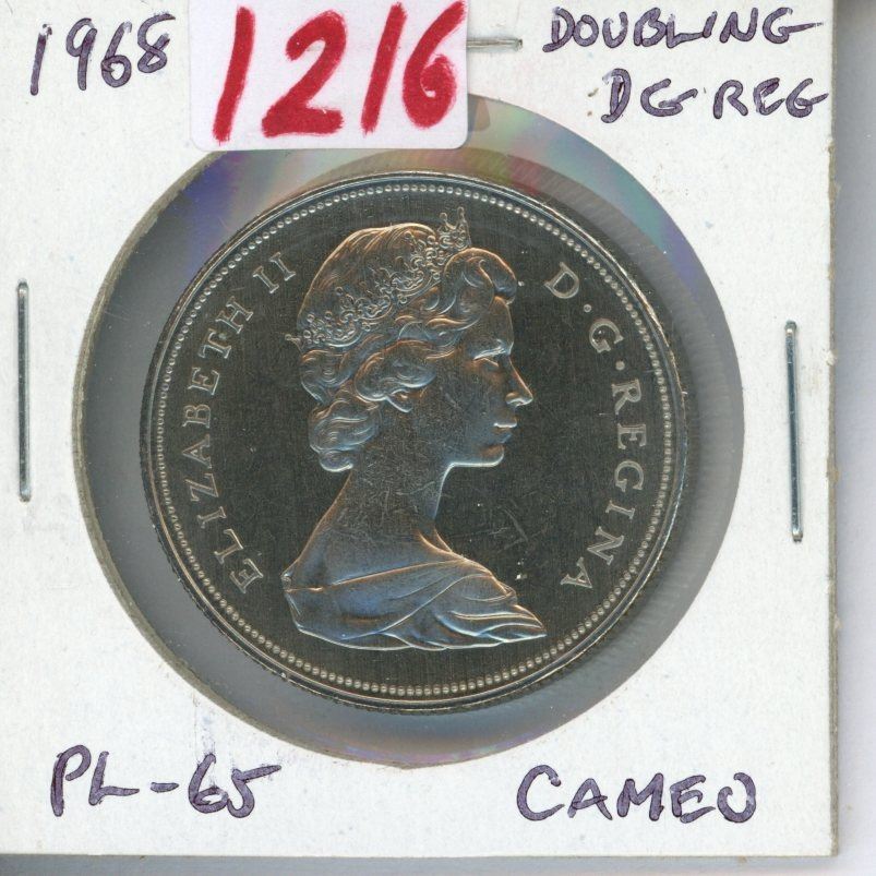 1968 Nickel Dollar. Coin displays Doubling on G REGINA on Obverse. Proof Likie-65 with Cameo.
