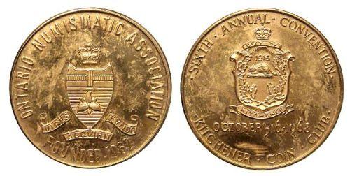 Ontario Numismatic Association Gold medal. 1968 Kitchener Coin Club 6th annual convention. Obverse: Coat of arms with ONTARIO NUMISMATIC SOCIETY FOUNDED 1962. Reverse: Coat of arms with KITCHENER COIN CLUB, 6TH ANNUAL CONVENTION, OCT. 5, 6 - 1968. 28.8 m