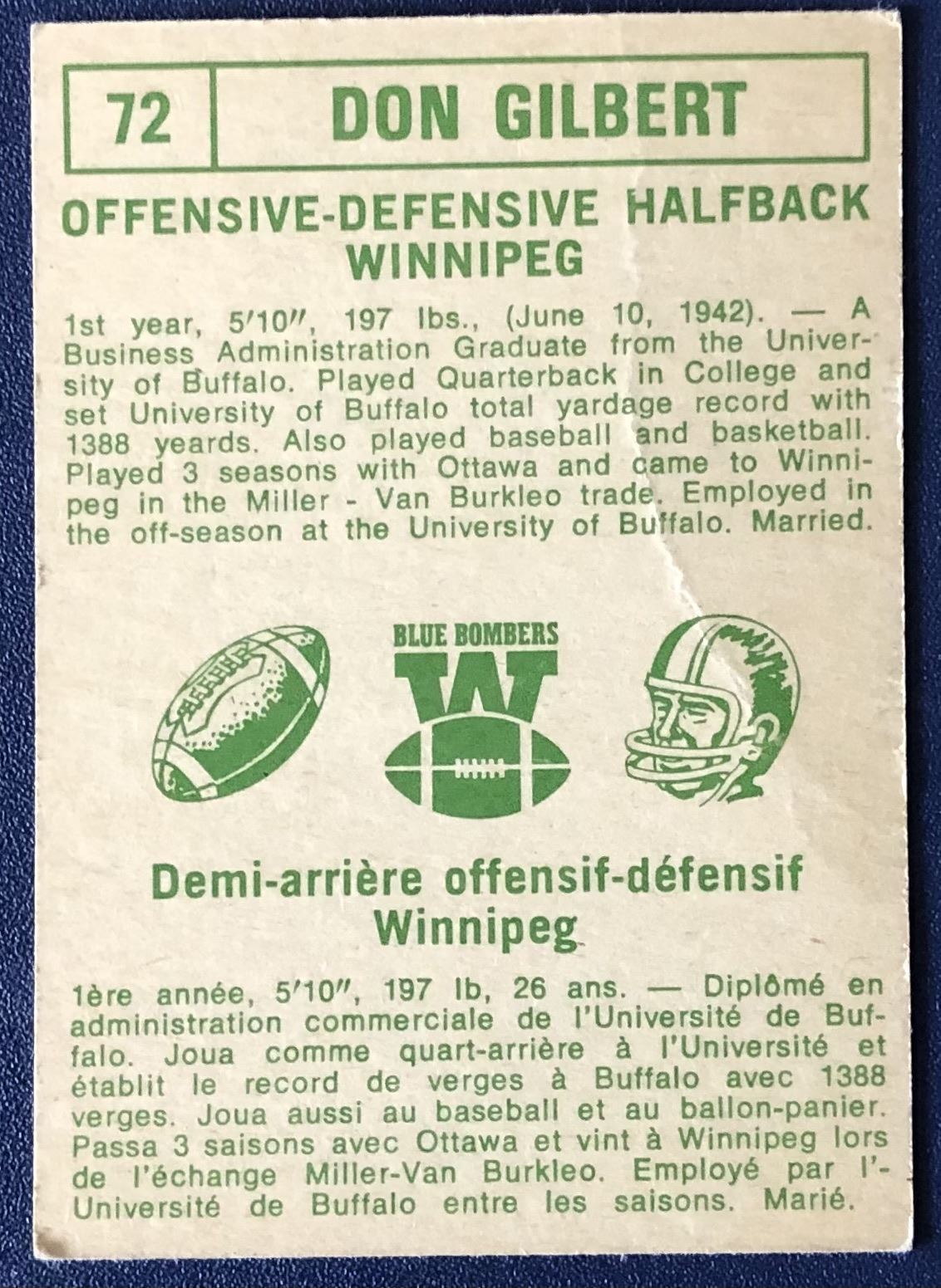 Card #72, creasing, filler quality CFL, OPC, football, vintage
