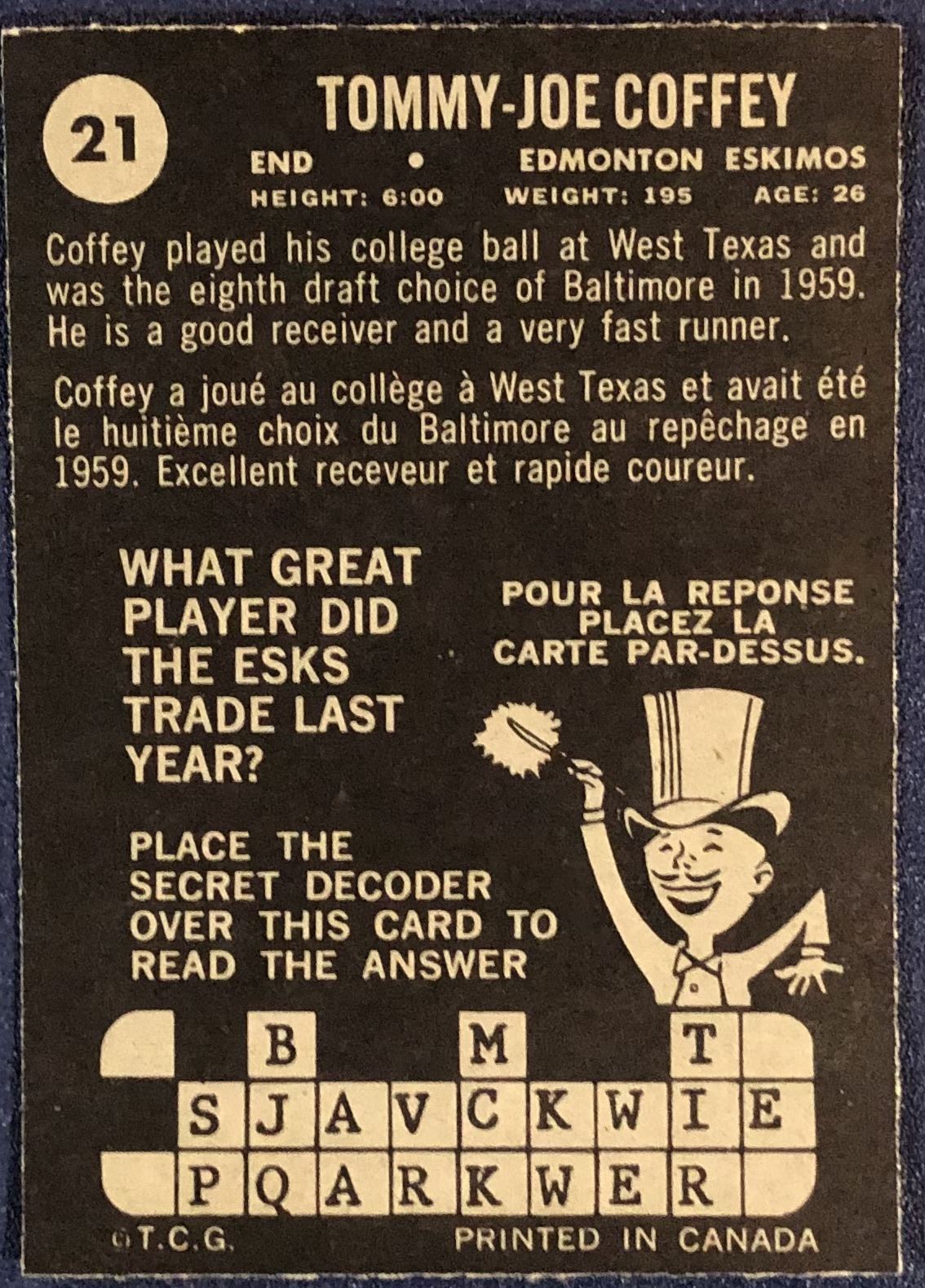 Card #21 CFL, football, hall of fame, vintage