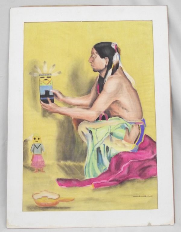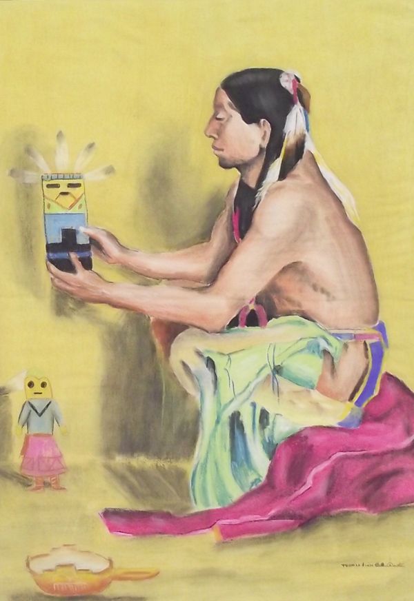 1968 Original Pastel - Thomas Arriso. A Native American man is holding kachinas, which are story dolls. 24''H x 17''W. Unframed but in protective material, can be shipped rolled without matting