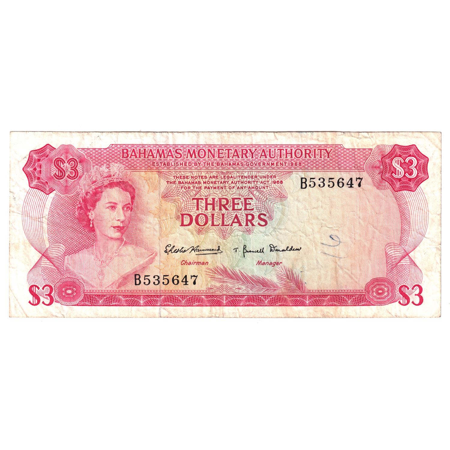 1968 Pick #28a Bahamas $3 VF (Writing)