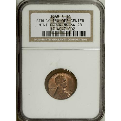 <B>1968-S 1C Cent--Struck 15% Off Center--MS64 Red NGC.</B></I><BR><BR><b>Shipping:</b> Coins & Currency (<a target="_blank" href="http://www.heritageauctions.com/common/shipping.php">view shipping information</a>)