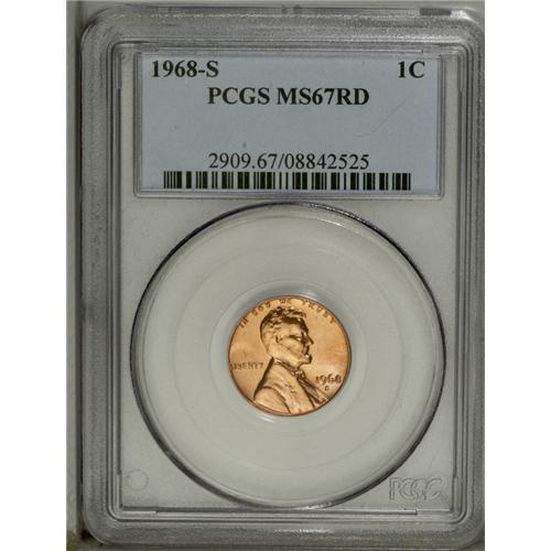 1968-S 1C MS67 Red PCGS. A sharply struck straw-gold S