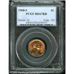 <B>1968-S 1C MS67 Red PCGS.</B></I> Even cherry red surfaces. A lovely example of this modern, but seldom certified Lincoln cent. Population: 22 in 67, 1 finer (1/05).<BR><I>From The Kim Mitchell Collection, Part Two.</B></I> Lot:5580
