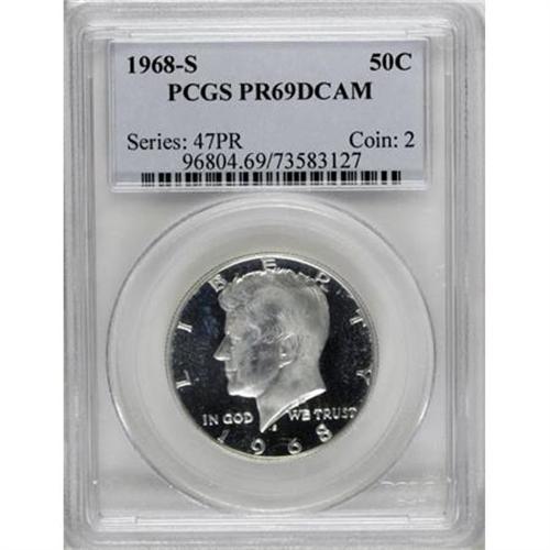 <B>1968-S 50C PR69 Deep Cameo PCGS.</B></I> . PCGS Population (269/16). NGC Census: (161/0). Numismedia Wsl. Price for NGC/PCGS coin in PR69: $210. (#96804)<BR><BR><b>Shipping:</b> Coins & Currency (<a target="_blank" href="http://www.heritageauctions.com/common/shipping.php">view shipping information</a>)