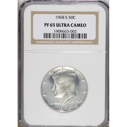 <B>1968-S 50C PR65 Deep Cameo NGC.</B></I> NGC Census: (5/509). PCGS Population (37/1756). Numismedia Wsl. Price: $16. (#96804)<BR><BR><b>Shipping:</b> Coins & Currency (<a target="_blank" href="http://www.heritageauctions.com/common/shipping.php">view shipping information</a>)
