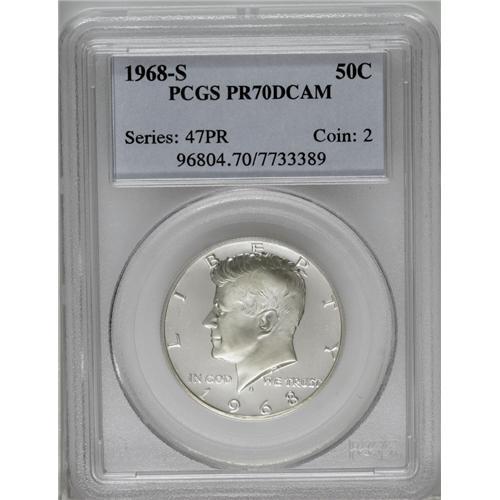 <B>1968-S<50C> PR70 Deep Cameo PCGS.</B></I> Bountifully full and carefully preserved with stunning white-on-black contrast and no visible blemishes. Population: 16 in 70, 0 finer (3/06).<BR><I>From The J. S. Hamilton Registry Set of Proof Kennedy Half Dollars.</B></I> <BR><BR><B>Important notice:</B> Heritage usually auctions material at the rate of 200-250 lots per hour. On some occasions eBay Live bid software or the Internet may not be able to keep up with the pace of the auction. We recommend placing a realistic absentee bid now as insurance to avoid disappointment. Occasionally the auctioneer may eliminate or reject an eBay Live bid, and the auctioneer may also reopen a lot after the close of the eBay live bidding (usually because we missed an audience bid), and may reject your bid even if it shows you as the winning bidder. By bidding via eBay Live, you agree that Heritage may award the lot to another bidder at its sole discretion under the circumstances described above or any other reasonable circumstances. Since eBay bids are not shown to us until we open the lot on the floor, we treat those bids just like floor bids. In most cases the floor responds before the eBay bid is presented to us, due to Internet lag time, so for consistency we have made it a policy that floor bids are always considered first over tie eBay live bids. Also please note that all Heritage lots purchased through eBay Live carry a 20% Buyer's Premium. Please make sure you read the Terms and Conditions before you bid. This lot is being auctioned in conjunction with a live floor auction by Heritage Galleries & Auctioneers. All final auction and invoice information will be supplied by Heritage Galleries & Auctioneers, and all other information should be considered preliminary. Lot:3172 <BR><BR><B>Winning Notification and Billing:</B> After the FINAL session in this auction is complete, Heritage will send e-mail and snail mail invoices. This process normally takes several days. All final auction and invoice information will be supplied by Heritage Galleries & Auctioneers, and all other information should be considered preliminary. <BR><BR>This auction will be conducted on a live auction floor and over the Internet through eBay Live. If you choose to place an absentee bid, please take a moment to <font color='#0000ff'><u><a href='http://pages.ebay.com/liveauctions/help/before/laabsentee.html'>learn how eBay Live absentee bidding works</a></u></font><font color='#000000'>