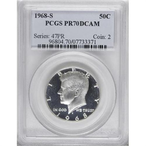 <B>1968-S 50C PR70 Deep Cameo PCGS.</B></I> Ice-white motifs rise above the glassy fields. A pristine example that most would call fully brilliant, despite a trace of olive toning on the cheekbone. 1968 was the first year of San Francisco proof coinage, although the special mint sets of 1965 to 1967 were also coined at the facility. Only a tiny portion of 1968 proofs display dramatic cameo contrast. Population: 16 in 70 Deep Cameo (11/07).<BR><I>From The Kallenberg #1 PCGS Registry Set Of Proof Half Dollars.</B></I><BR><BR><b>Shipping:</b> Coins & Currency (<a target="_blank" href="http://www.heritageauctions.com/common/shipping.php">view shipping information</a>)