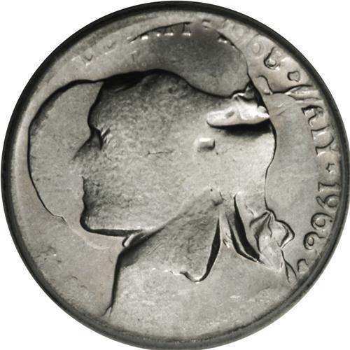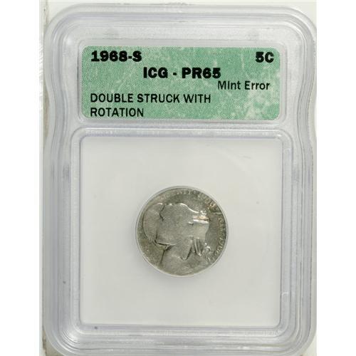 <B>1968-S 5C Jefferson Nickel--Double Struck In Collar--ICG PR65.</B></I> A moderately reflective blue-toned piece that rotated approximately 80 degrees between strikes. Ill-defined portraits intersect on the obverse, and the crossed images of Monticello appear to form an "X" on the reverse.<BR><BR><b>Shipping:</b> Coin/Currency (<a target="_blank" href="http://www.heritageauctions.com/common/shipping.php">view shipping information</a>)
