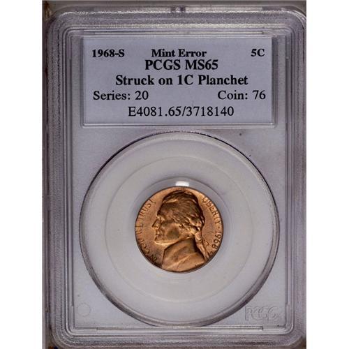 1968-S 5C Nickel--Struck on 1C Planchet MS65 PCGS. 1968-S[5C] Jefferson Nickel--Struck on a Cent Pla