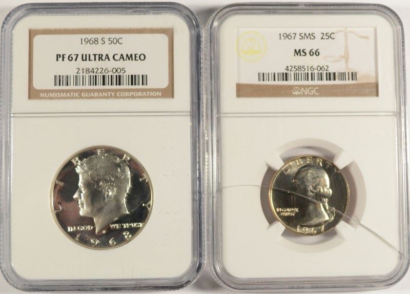 1968-S KENNEDY HALF NGC PF-68 ULTRA CAMEO, 67 SMS QUARTER, NGC MS-66