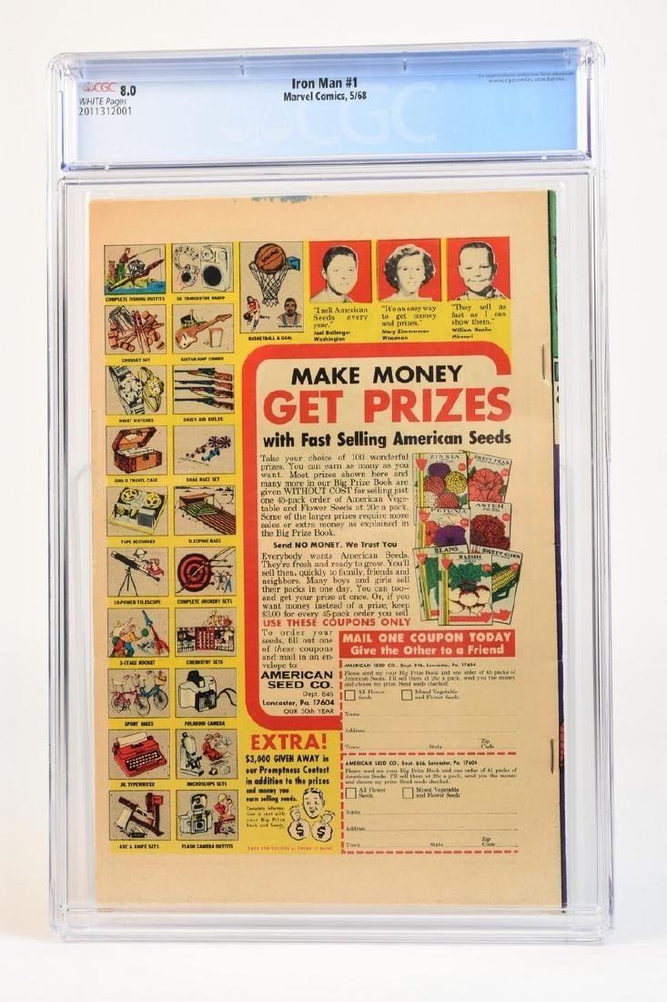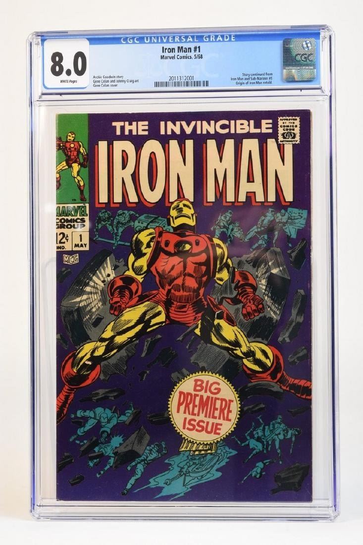 1968 The Invincible Iron Man #1 CGC 8.0 (white pages) code 2011312001. Archie Goodwin story. Gene Colan and Johnny Craig art. Gene Colan cover. Story continued from Iron Man and Sub-Mariner #1. Origin of Iron Man retold