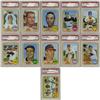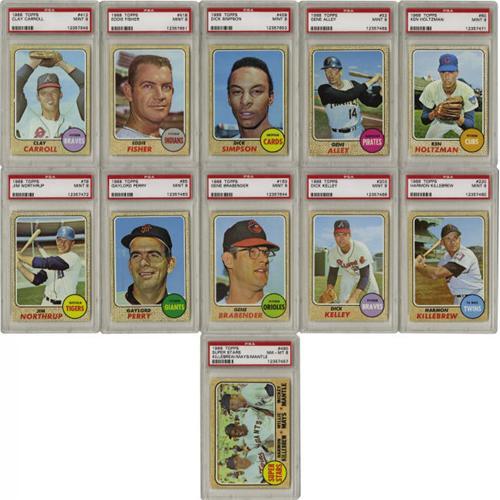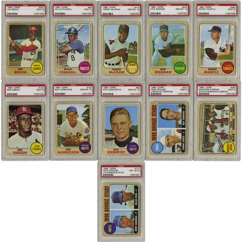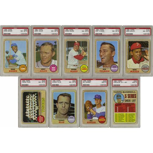 <B>1968 Topps Baseball High-Grade Complete Set (598).</B></I> With a border that appears to be a burlap fabric, this issue is well known for having condition issues from chipping and is prone to showing wear. Thankfully that is far from the case with this blazing high grade set. This top quality example includes 31 cards which have been graded by PSA and have an aggregate SMR value of $6,230. Includes: Graded Cards - <B>PSA GEM MINT 10:</B></I> 4 cards w/ #'s 63, 132, 413, 442. <B>PSA MINT 9:</B></I> 18 Cards w/ #'s 53, 60, 78, 85 Perry, 86 Stargell, 100 Gibson, 163, 203, 220 Killebrew, 247 Bench, 249, 280 Mantle, 356, 412, 418, 459, 480 Manager's Dream, 520 Brock. <B>PSA NM-MT 8:</B></I> 9 Cards w/ #'s 122, 174, 177 Ryan, 330 Maris, 346, 355 Banks, 490 Killebrew/Mays/Mantle, 528 Tigers. <B>Ungraded Cards -</B></I> Highlights Include #'s 1 Clemente LL (NM/MT), 20 Robinson (NM), 45 Seaver (NM), 50 Mays (EX/MT), 80 Carew (NM), 110 Aaron (VG/EX), 150 Clemente (EX/MT), 230 Rose (EX), 240 Kaline (EX), 250 Yaz (NM), 408 Carlton (NM), 500 Robinson (EX/MT) 575 Palmer (NM). Grades 72% NM to NM-MT, 23% EX-MT, 5% EX or lesser. <BR><BR><B>Important notice:</B> Heritage usually auctions material at the rate of 200-250 lots per hour. On some occasions eBay Live bid software or the Internet may not be able to keep up with the pace of the auction. We recommend placing a realistic absentee bid now as insurance to avoid disappointment. Occasionally the auctioneer may eliminate or reject an eBay Live bid, and the auctioneer may also reopen a lot after the close of the eBay live bidding (usually because we missed an audience bid), and may reject your bid even if it shows you as the winning bidder. By bidding via eBay Live, you agree that Heritage may award the lot to another bidder at its sole discretion under the circumstances described above or any other reasonable circumstances. Since eBay bids are not shown to us until we open the lot on the floor, we treat those bids just like floor bids. In most cases the floor responds before the eBay bid is presented to us, due to Internet lag time, so for consistency we have made it a policy that floor bids are always considered first over tie eBay live bids. Also please note that all Heritage lots purchased through eBay Live carry a 22.5% Buyer's Premium. Please make sure you read the Terms and Conditions before you bid. This lot is being auctioned in conjunction with a live floor auction by Heritage Galleries & Auctioneers. All final auction and invoice information will be supplied by Heritage Galleries & Auctioneers, and all other information should be considered preliminary. Lot:19621 <BR><BR><B>Winning Notification and Billing:</B> After the FINAL session in this auction is complete, Heritage will send e-mail and snail mail invoices. This process normally takes several days. All final auction and invoice information will be supplied by Heritage Galleries & Auctioneers, and all other information should be considered preliminary. <BR><BR>This auction will be conducted on a live auction floor and over the Internet through eBay Live. If you choose to place an absentee bid, please take a moment to <font color='#0000ff'><u><a href='http://pages.ebay.com/liveauctions/help/before/laabsentee.html'>learn how eBay Live absentee bidding works</a></u></font><font color='#000000'>