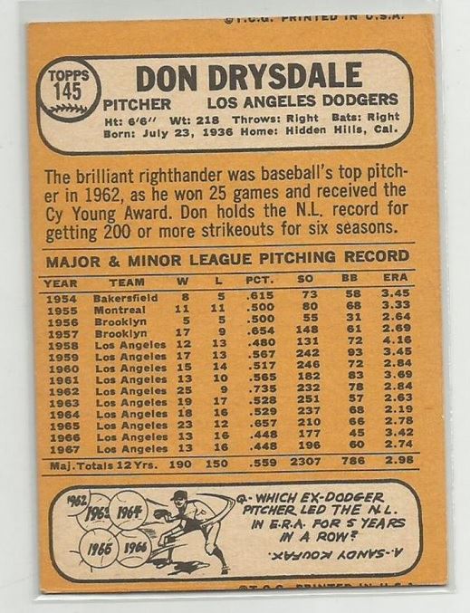 This Vintage 1968 Topps Don Drysdale Card was mis-cut at the Topps Factory, but otherwise in Excellent Condition.