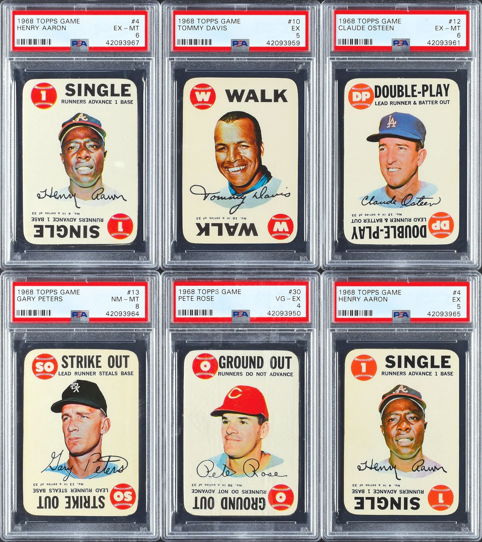 A small hoard of the 1968 Topps Game cards, an insert into packs. Includes: Graded Cards - #4 Aaron (2, 1 EX-MT 6 & 1 EX 5), 10 Davis (EX 5), 12 Osteen (EX-MT 6), 13 Peters (NM-MT 8) and 30 Rose (VG-EX 4).