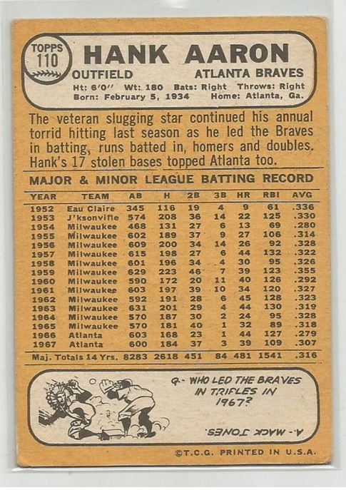 This Original 1968 Topps Hank Aaron Card #110 is in Very Good to Excellent Condition.