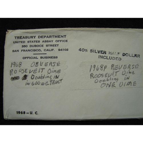 1968 U.S. MINT SET. Consists of Philadelphia & Denver sets. Double die on obverse of Denver Roosevelt dime and on reverse of Philadelphia Roosevelt dime. In original Treasury Department envelope.