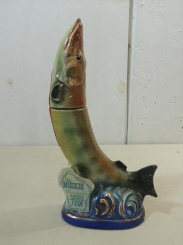 1968 VINTAGE JIM BEAM WHISKEY CERAMIC DECANTER MUSKIE STATE FISH OF WISCONSIN. AS SHOWN. VIEW PICTURE FOR DETAIL.